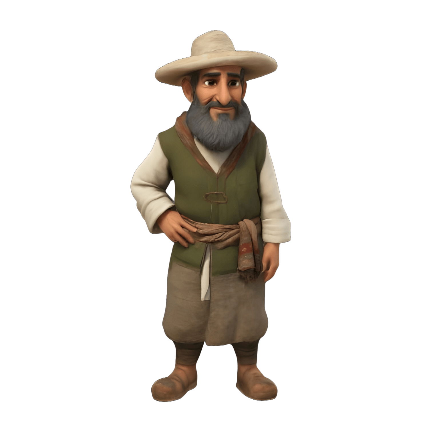 - A bearded farmer with a warm smile, wearing a straw hat and traditional attire.