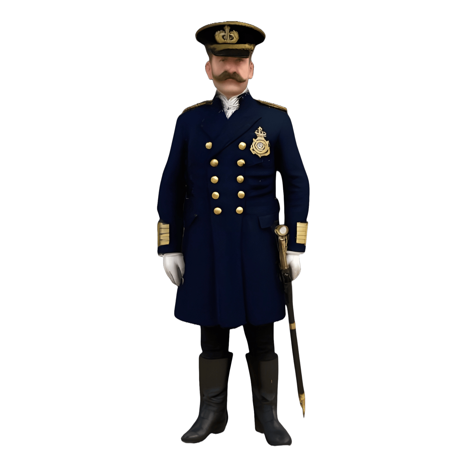 - A distinguished naval officer in a royal blue uniform, complete with a peaked cap and medals.