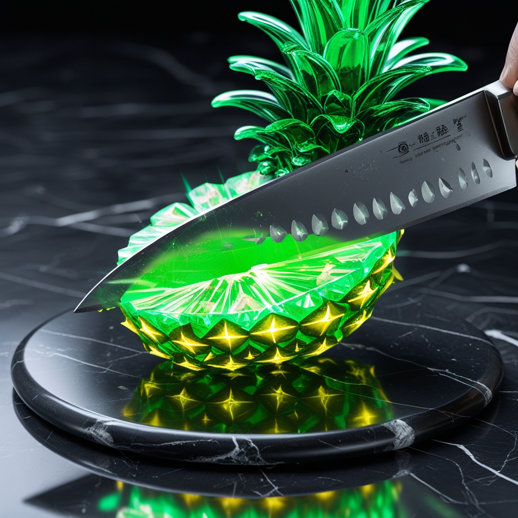 Realistic 4K footage close-up of a knife rapidly cutting a neon green crystal pineapple on a black marble slab. The blade cuts through the whole fruit from top to bottom, breaking it into radiant, glowing slices. The inside of the fruit is also crystal. The sound is ASMR style.
