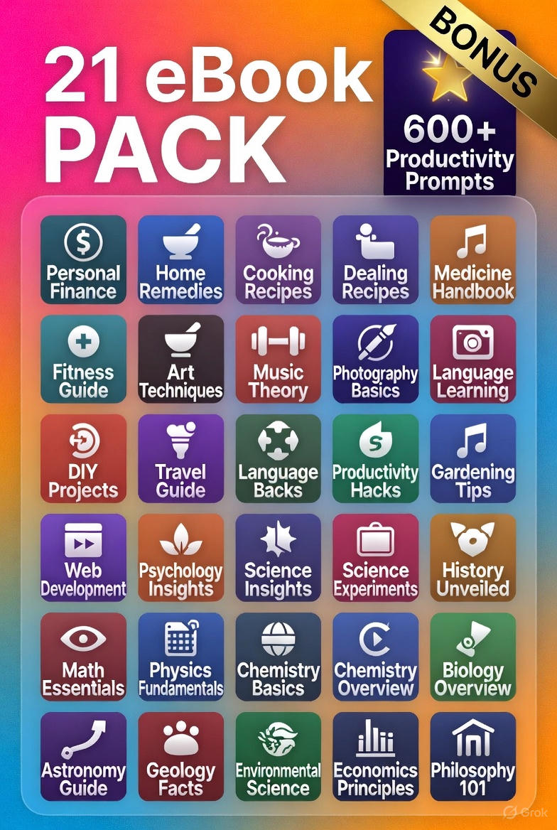- 22 Thematic Ebooks: Covers Finance, Marketing, Psychology, Fitness, Productivity, Travel, and more.
