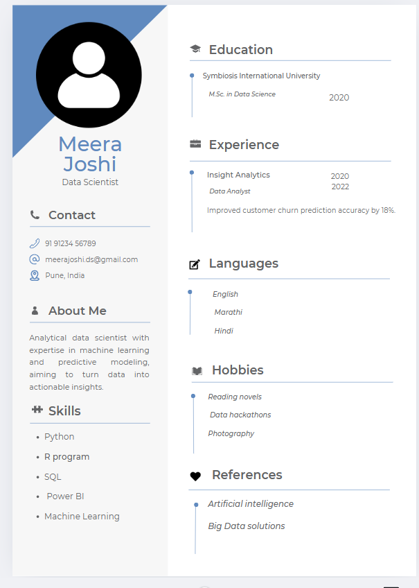 Designed for data science, analytics, and IT professionals, this CV highlights your skills, education, and experience in a clean and structured way.
