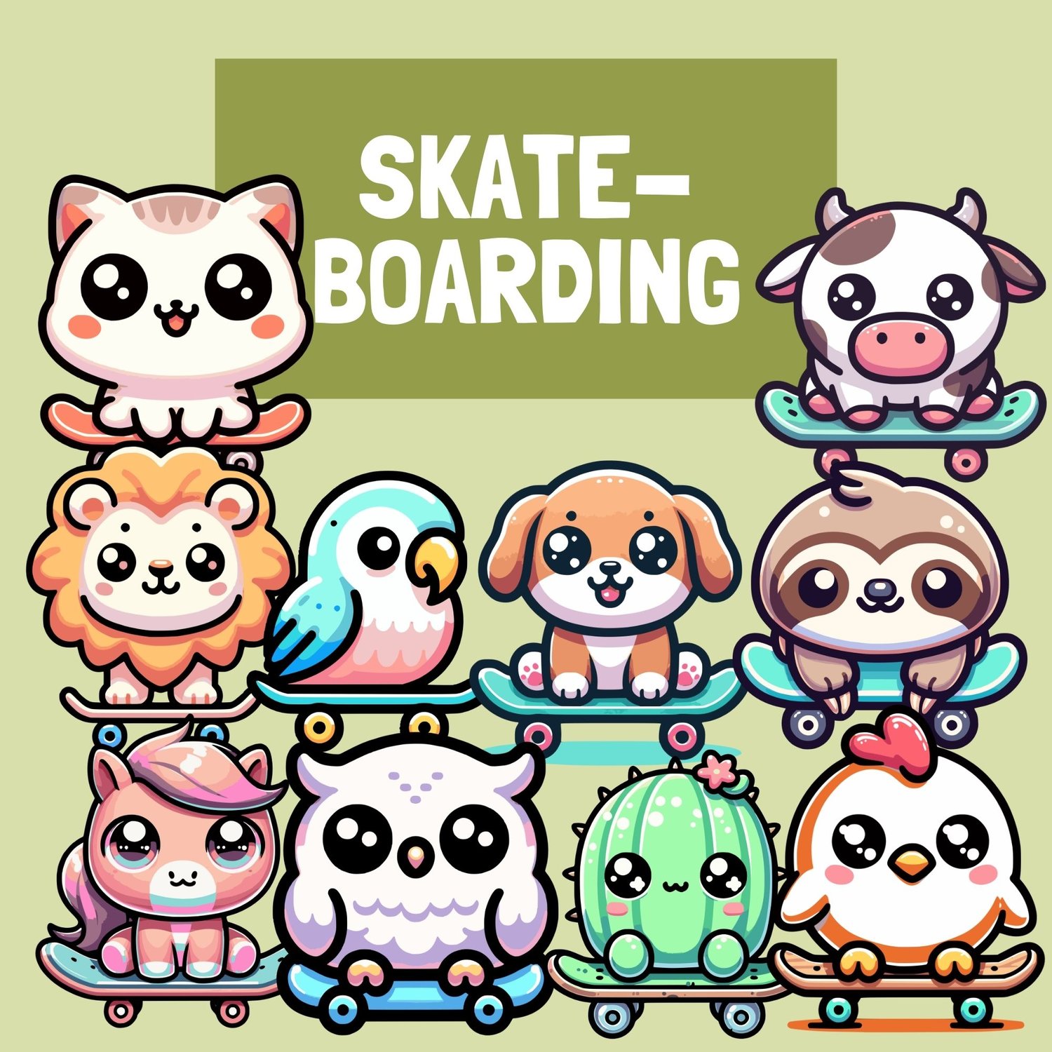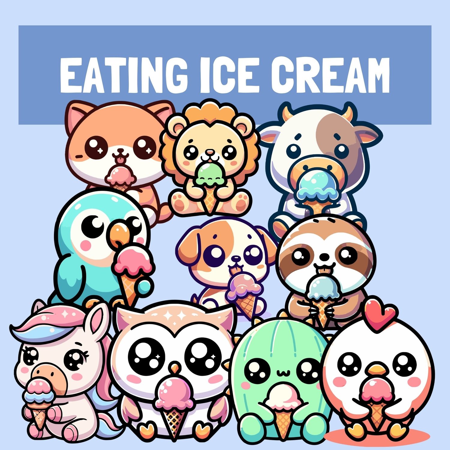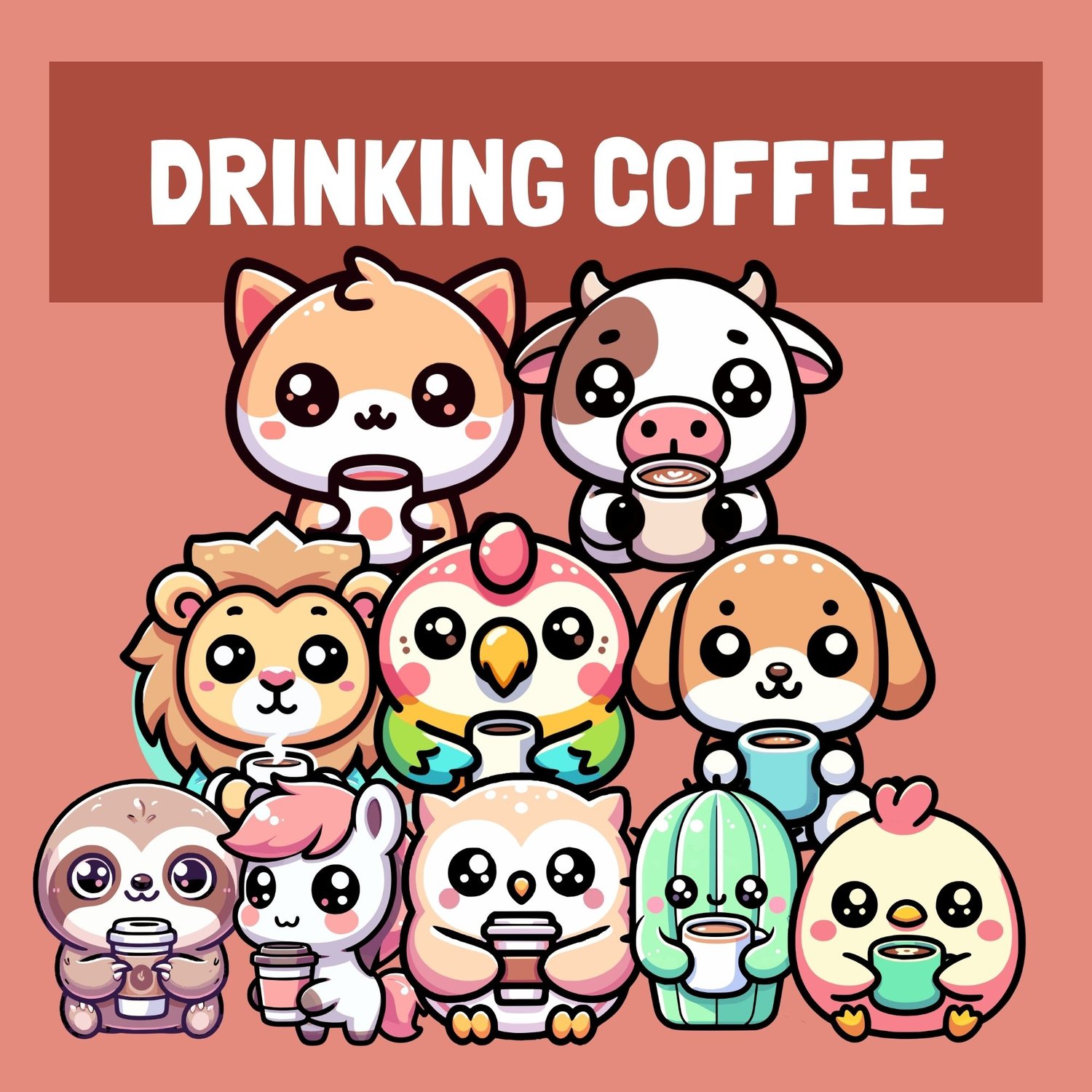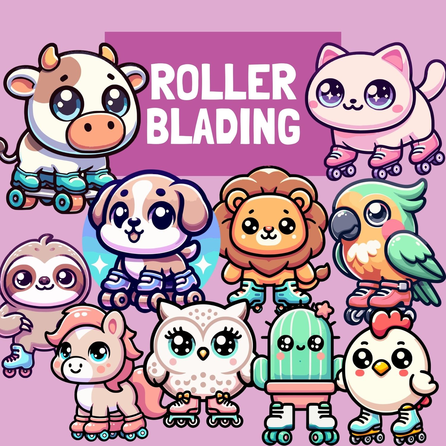 Chickens, cows, horses, owls, parrots, cats, puppies, cactuses, sloths, and lions!