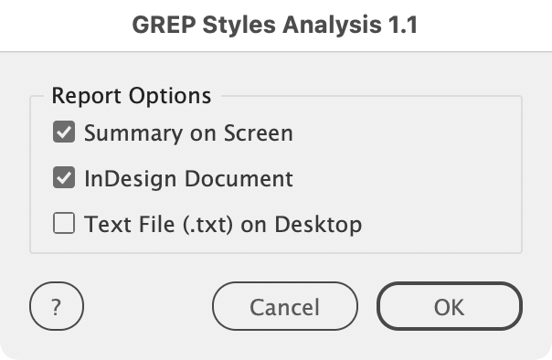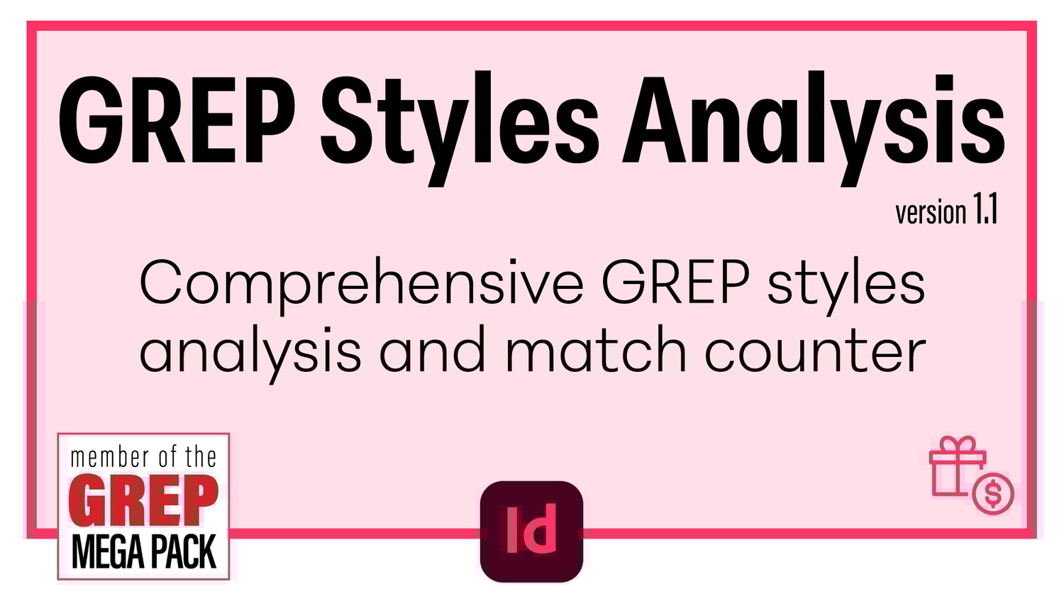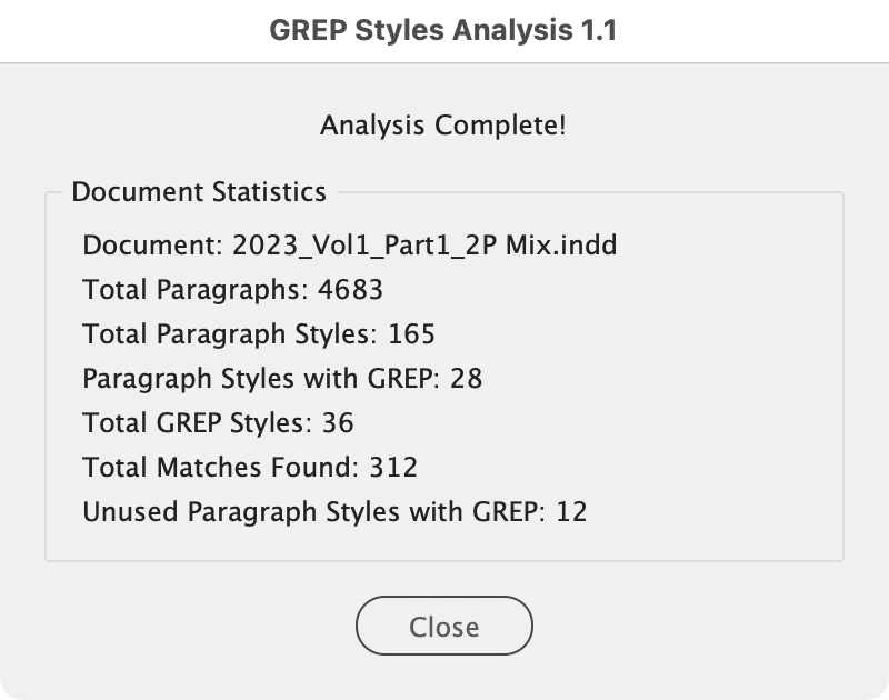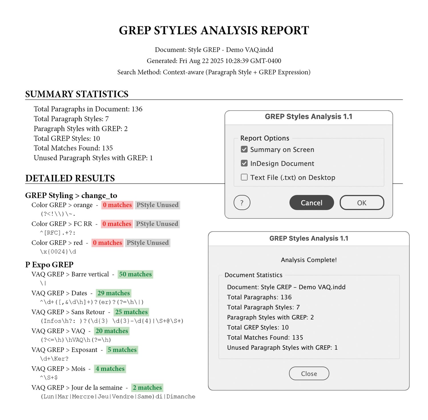 This script provides comprehensive analysis of GREP styles within your document's paragraph styles, delivering precise match counts for each GREP expression. The tool performs context-aware searches that combine paragraph styles with their associated GREP patterns to count actual matches throughout your document, giving you invaluable insights into which styles are actively working and which may need attention.