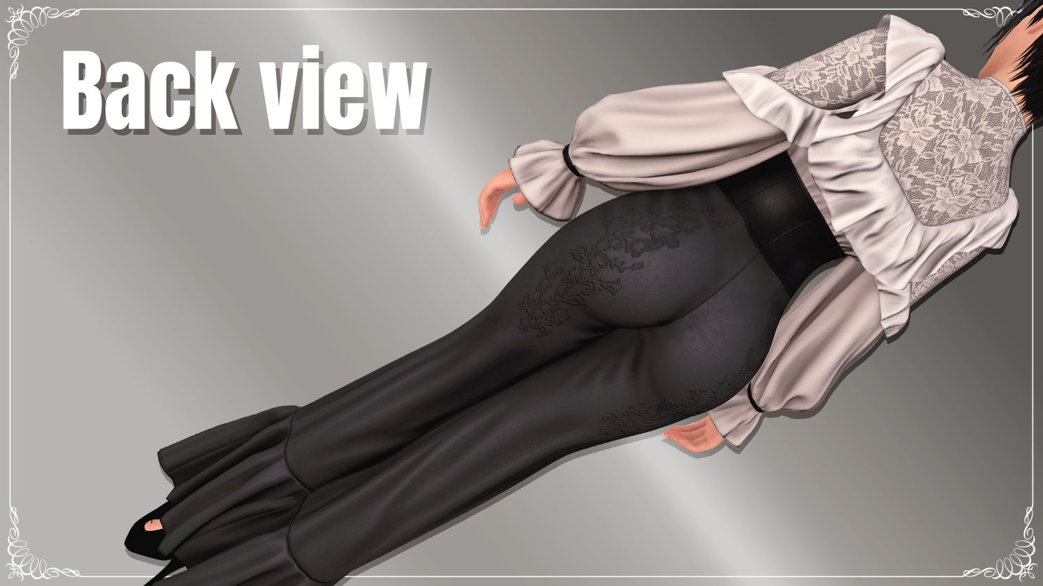 A two-piece outfit consisting of a heavily ruffled corsetted top with floral detailing, and slitted lace-up pants with floral accents.