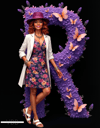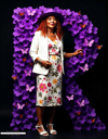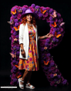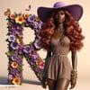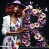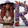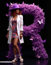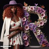 A giant letter R, beautifully formed from purple violets and fluttering butterflies, commands attention. Beside it, a woman in vibrant purple and floral patterns stands lovingly, enhancing the scene with grace and charm. This striking composition celebrates boldness and blooming elegance.