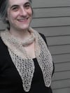 You might be putting on a plain T-shirt when the weather is warm and flowery… but you find that your outfit needs a little sumpin sumpin to make it work. This is your Sumpin! A little lace scarf that can be wrapped around your neck any which way, pointed ends over a shoulder or in the front. Worked in a 4 row repeat, this simple cellular lace pattern adds texture and depth without feeling too warm, heavy or complicated. Fingering weight yarn makes this lightweight and floaty, but the gauge is flexible and laceweight to dk weight yarn will work. With approximately 450 yards of fingering weight and size 6 (4mm) needles, the scarf measures approximately 9” by 60”.