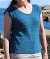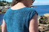 This lightweight summer tee is easy to knit and easy to wear. The tee is knit inside out so that no purling is required for the reverse stockinette body. Cap sleeves are finished as you go with the same I-cord trim that edges the back vent. Shadow rib at the shoulders and hem adds a bit of interest to the knitting and wearing.