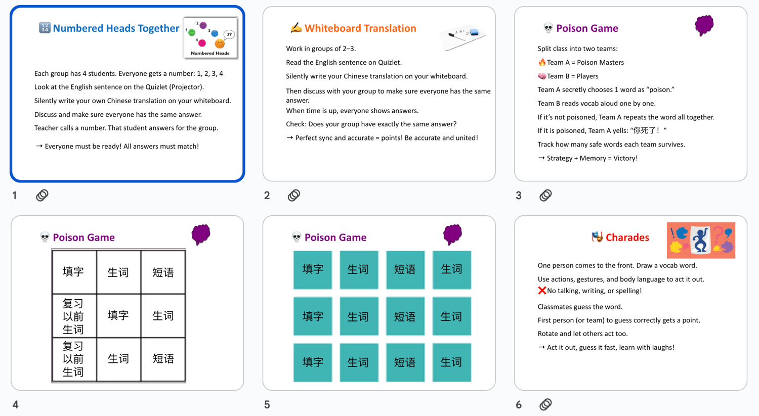 Including Numbered Heads Together, Whiteboard Translation, Poison Game, Charades, and more, each template has clear instructions with animations—click to show one step at a time, so students won’t get overwhelmed . Small icons help quickly recall and find activities. Low prep, high participation!