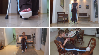 Julia präsentiert in Hosen ihren Gipsverband und ihren Gummiabsatz. Dann läuft sie auf Krücken und in Flip-Flops mit hohem Plateau. Als nächstes zieht sie ein Paar hohe Stiefel an und geht auf Krücken und einem Gummiabsatz.