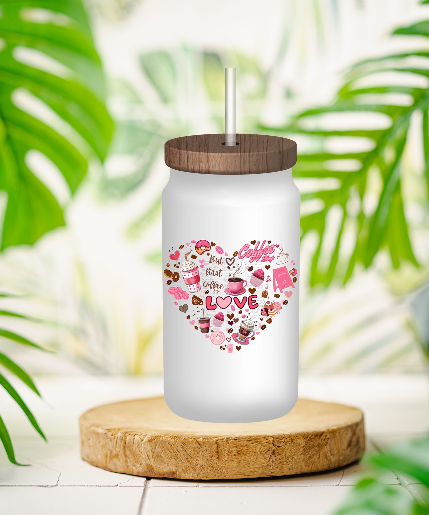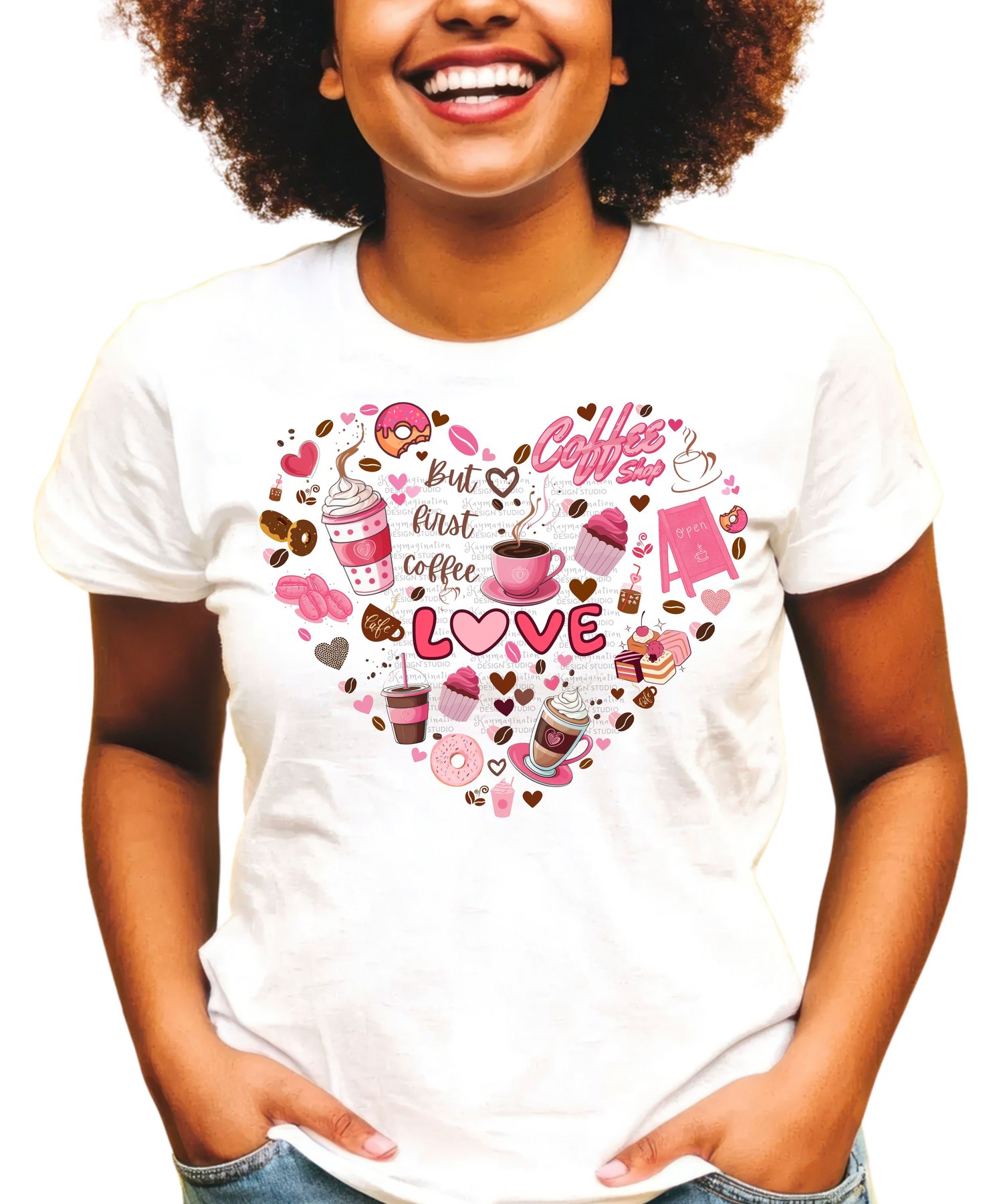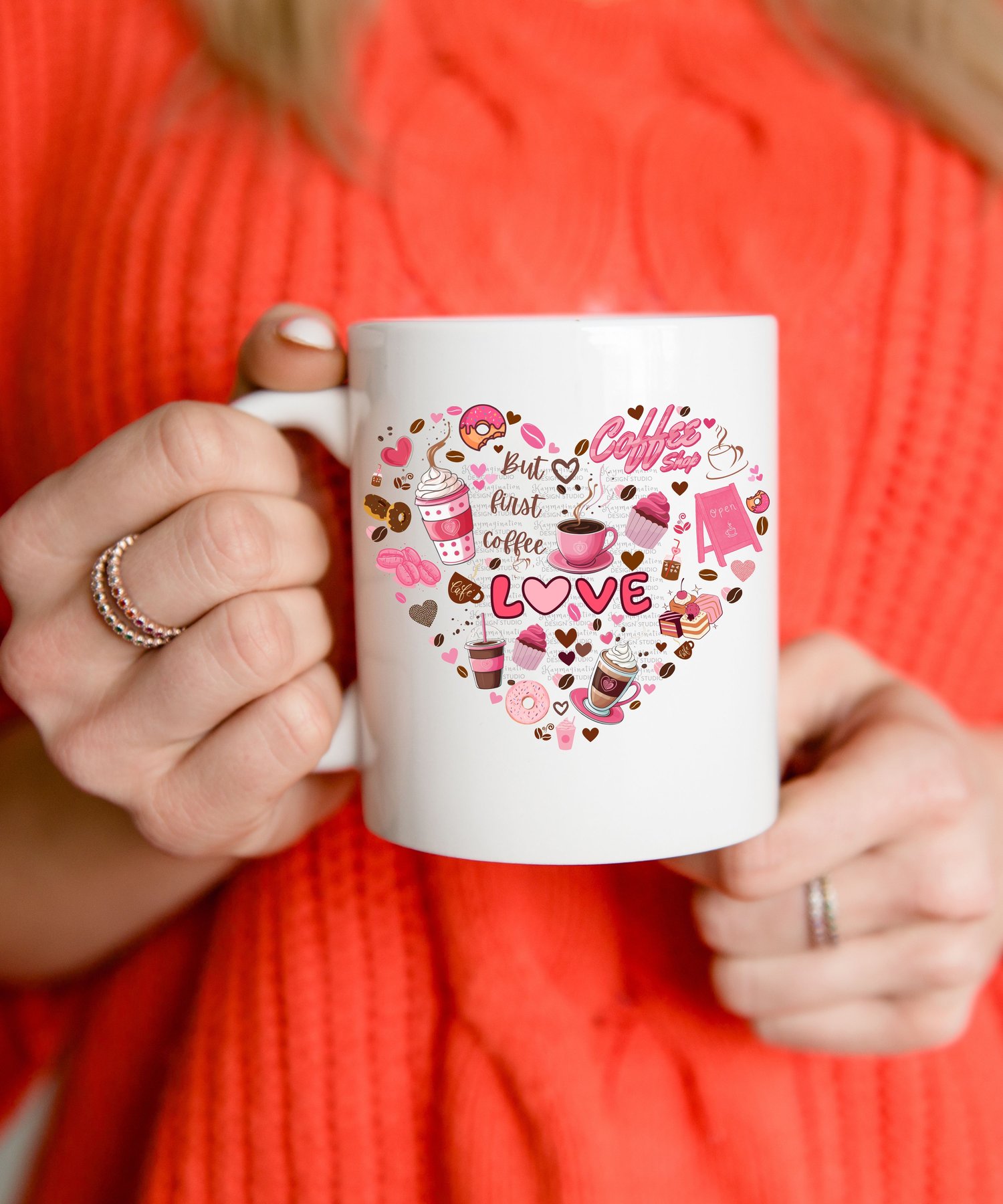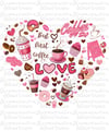 Start your day with a cup full of love! This heart-shaped coffee-themed design is perfect for caffeine lovers who can't function without their morning brew. Featuring coffee cups, donuts, beans, and fun lettering, it's ideal for mugs, tote bags, and digital prints. A must-have for any coffee addict!