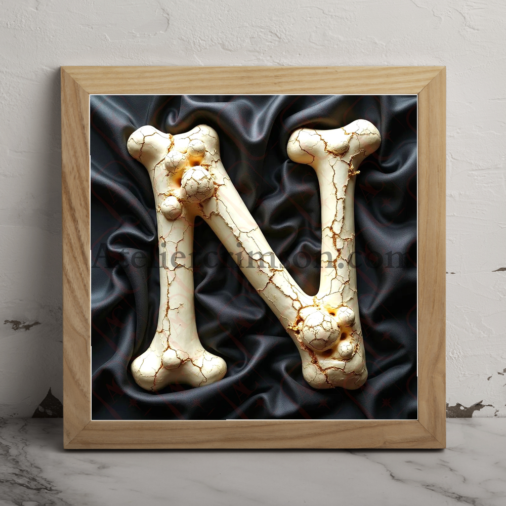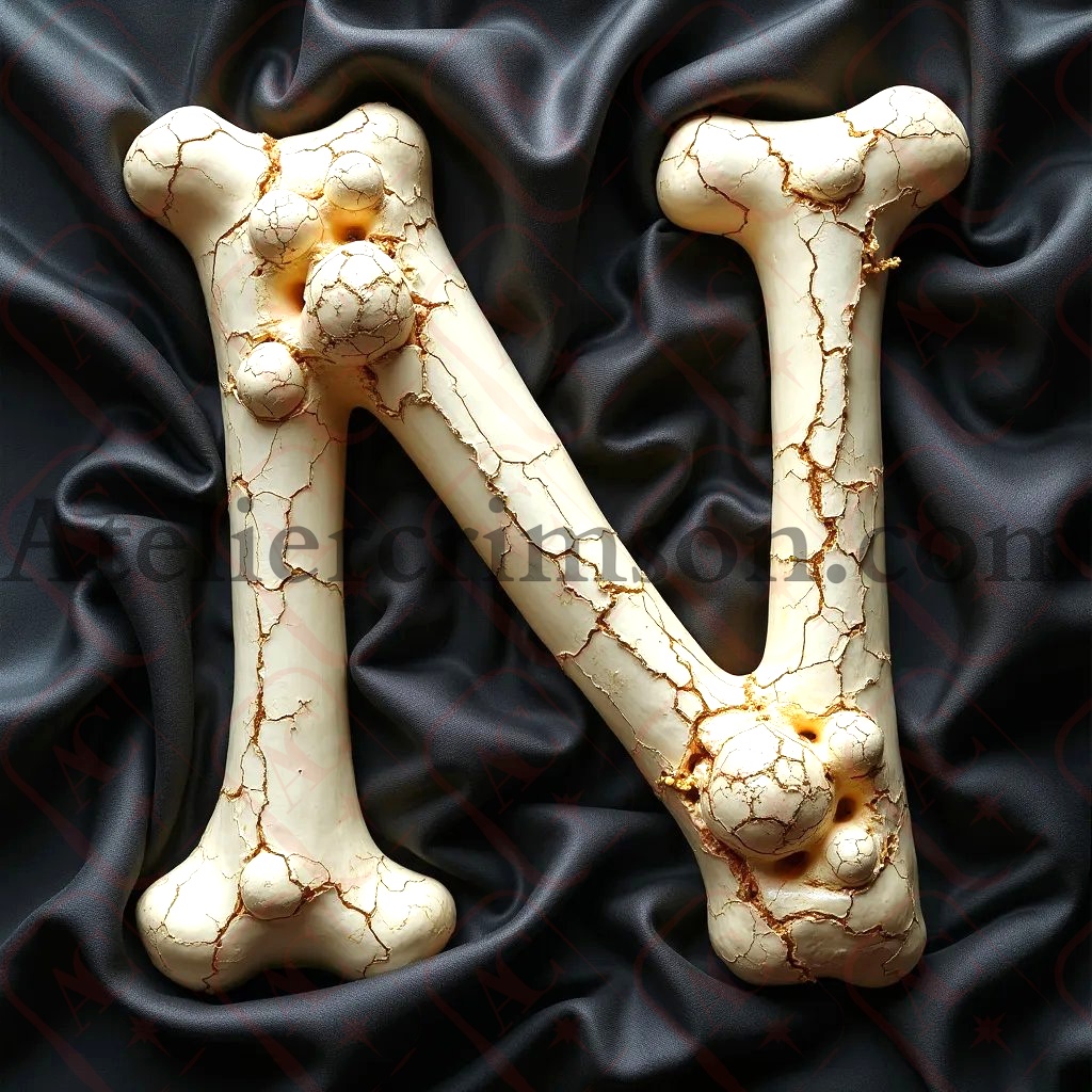 The letter N Bones with gold fissures A hauntingly beautiful character crafted from pristine human femur bones, intricately arranged to form a bold, serif typeface. Delicate golden fissures, reminiscent of kintsugi art, weave through the ivory-white osseous structure, adding an element of elegant repair. The character stands proudly on a luxurious marbled floor, its form casting subtle shadows. Behind it, a textured black linen backdrop provides a striking contrast, emphasizing the letter's ethereal beauty.