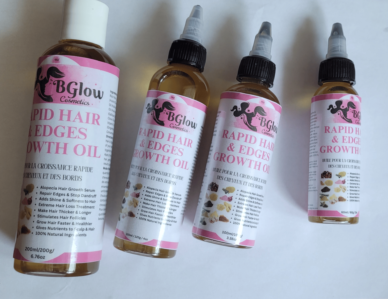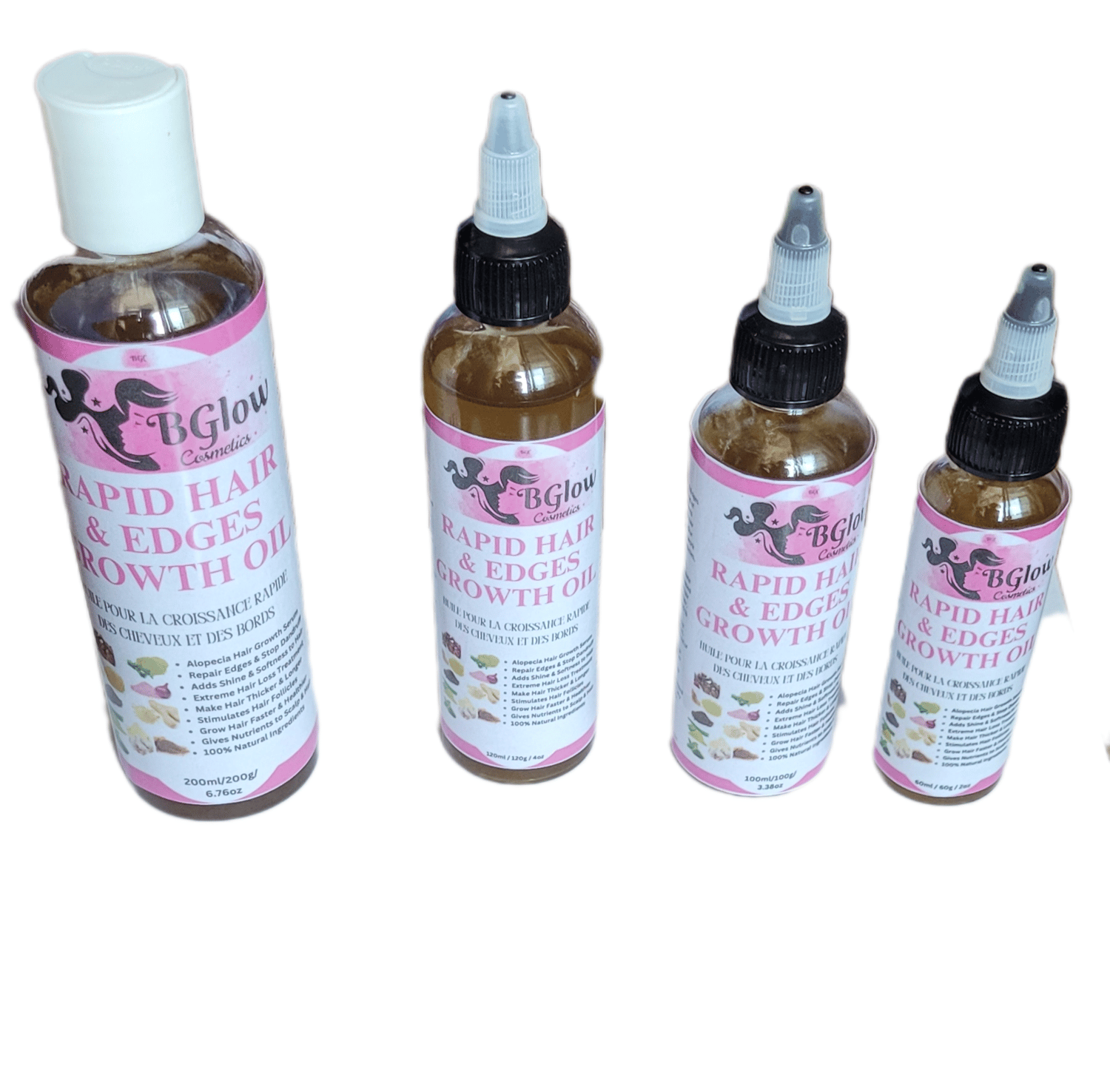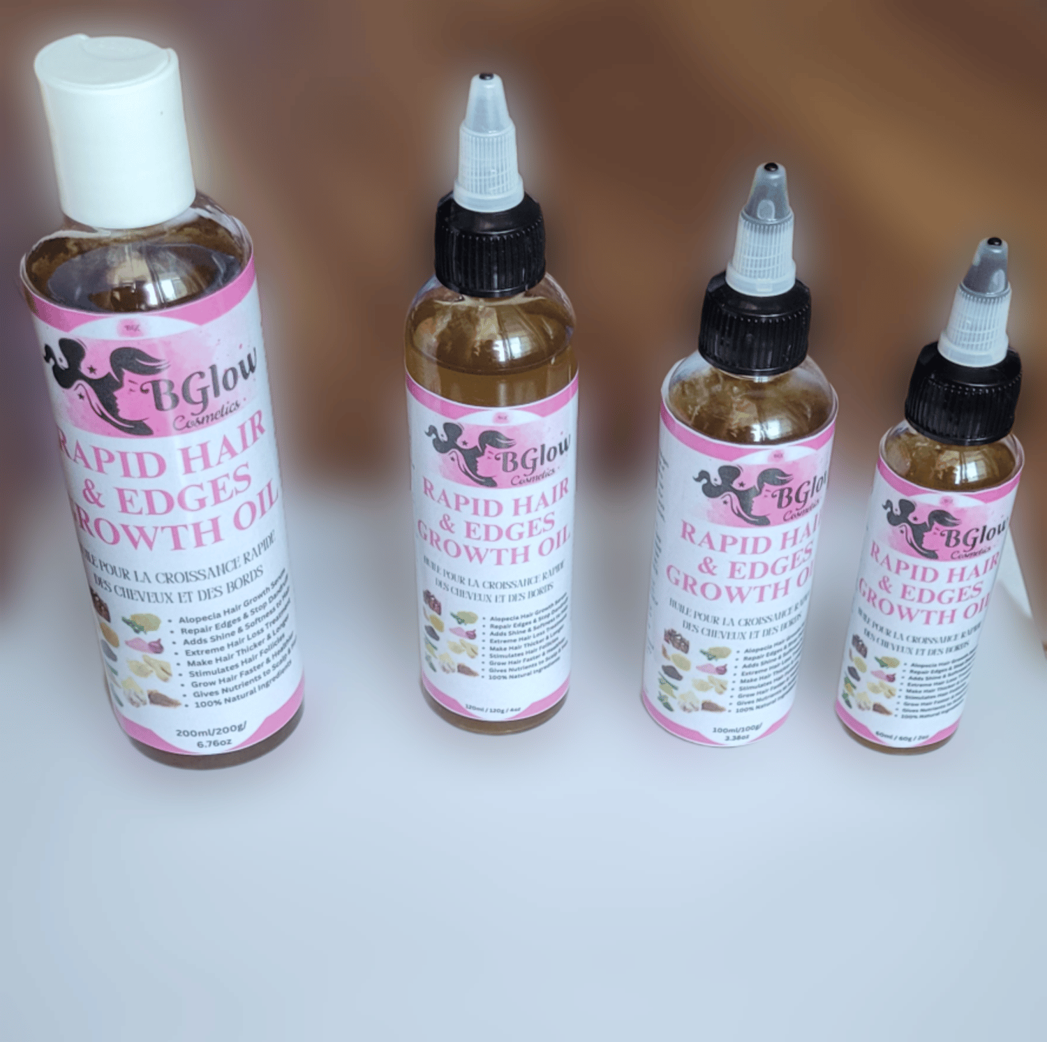 BGlow Rapid Hair and Edges Growth Oil is a premium blend of natural oils and essential nutrients designed to promote healthy hair growth and nourish your edges. Our carefully selected ingredients work together to strengthen hair follicles, reduce hair breakage, and stimulate dormant hair follicles for increased hair thickness and volume.