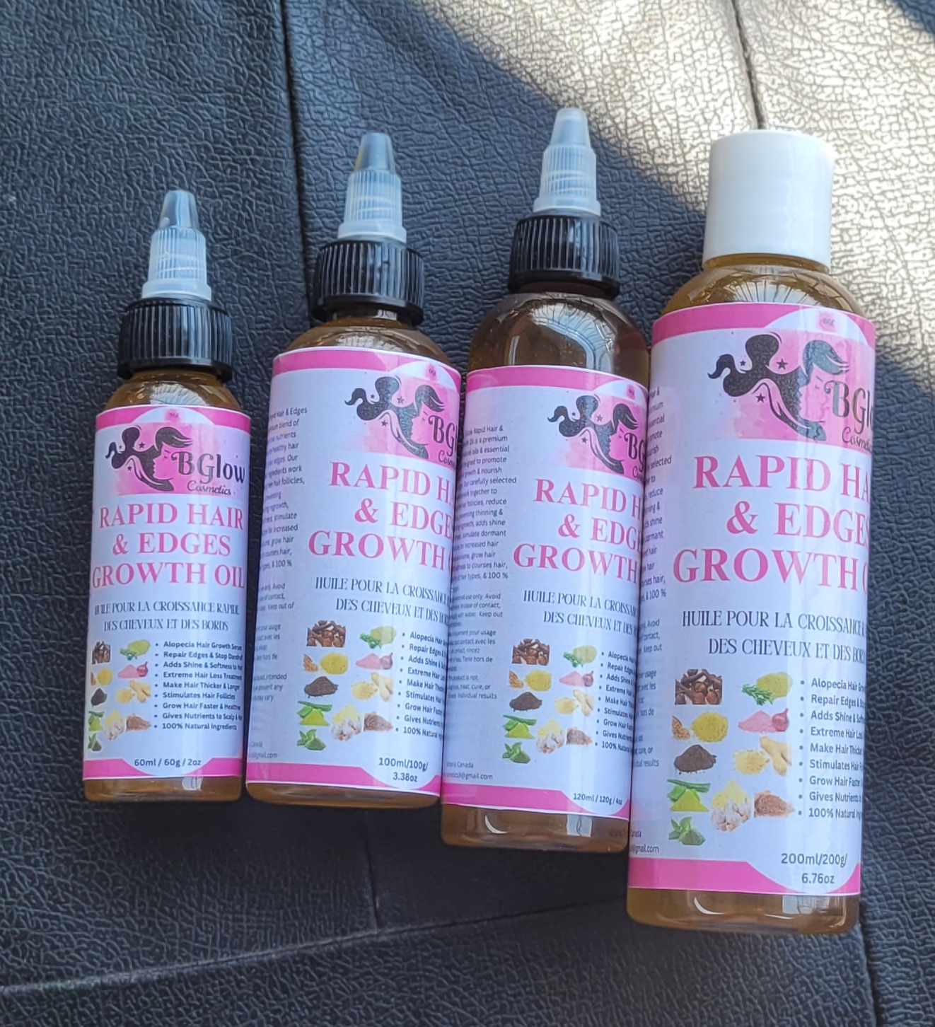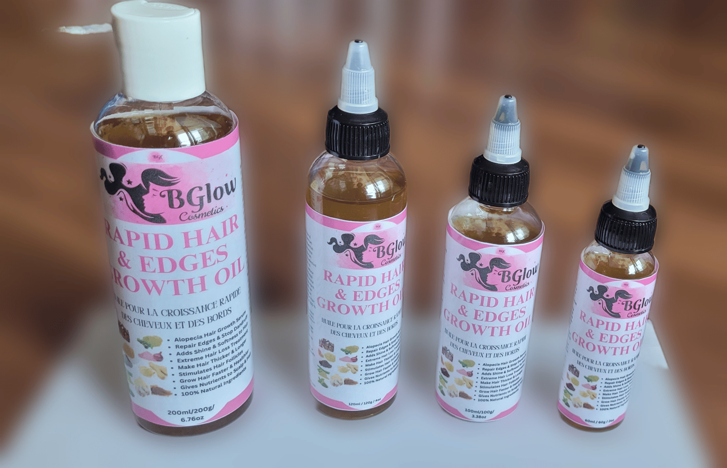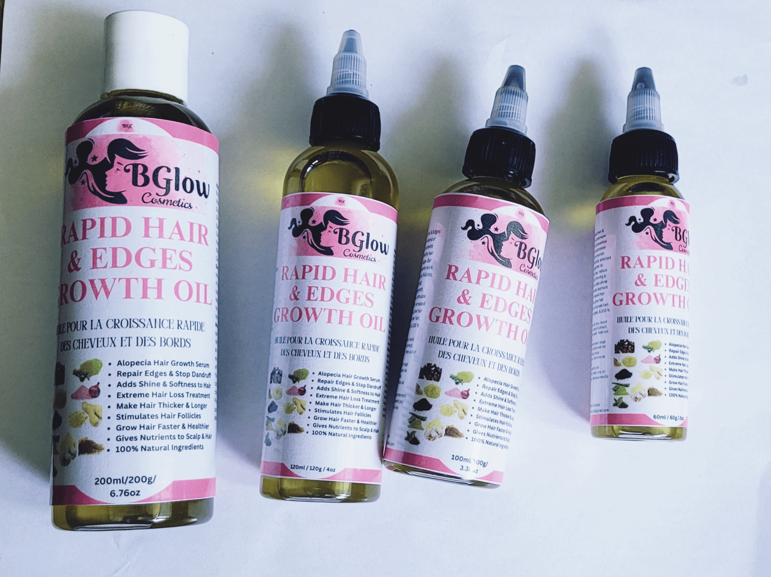 BGlow Rapid Hair and Edges Growth Oil is a premium blend of natural oils and essential nutrients designed to promote healthy hair growth and nourish your edges. Our carefully selected ingredients work together to strengthen hair follicles, reduce hair breakage, and stimulate dormant hair follicles for increased hair thickness and volume.