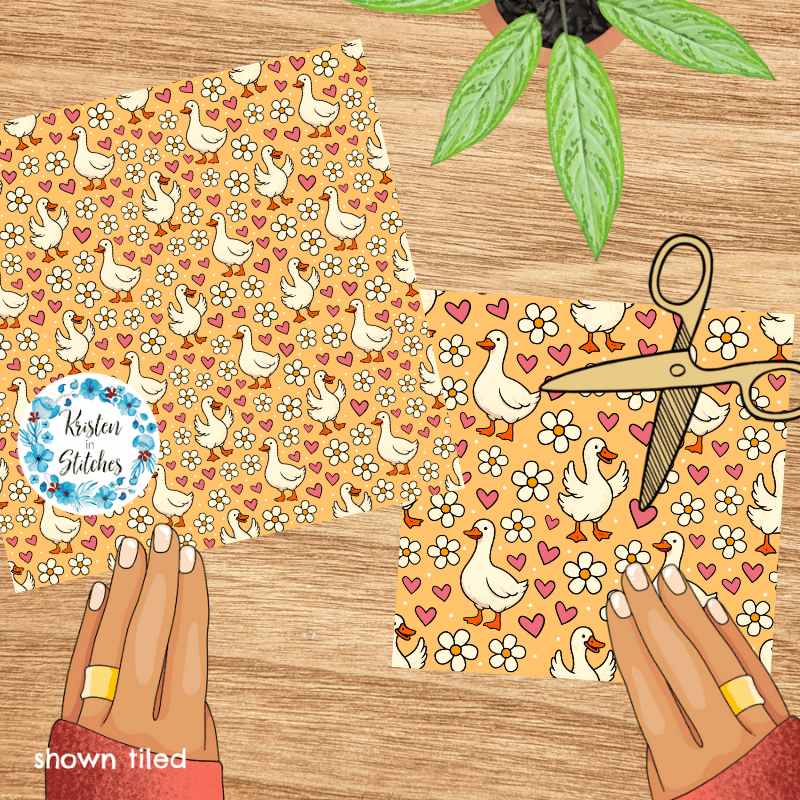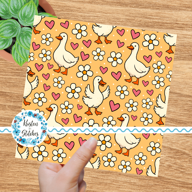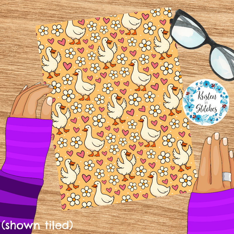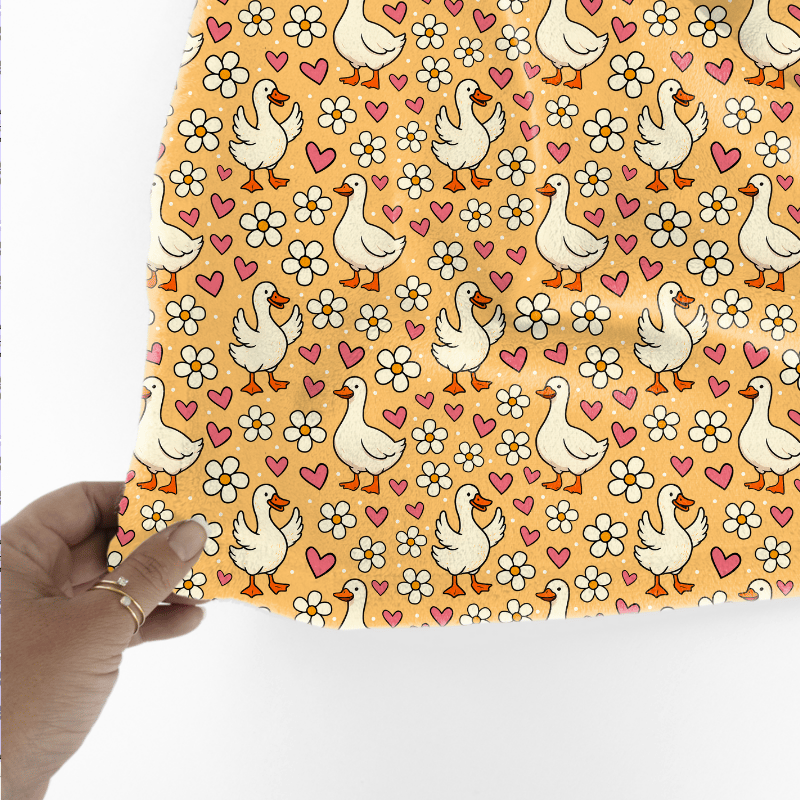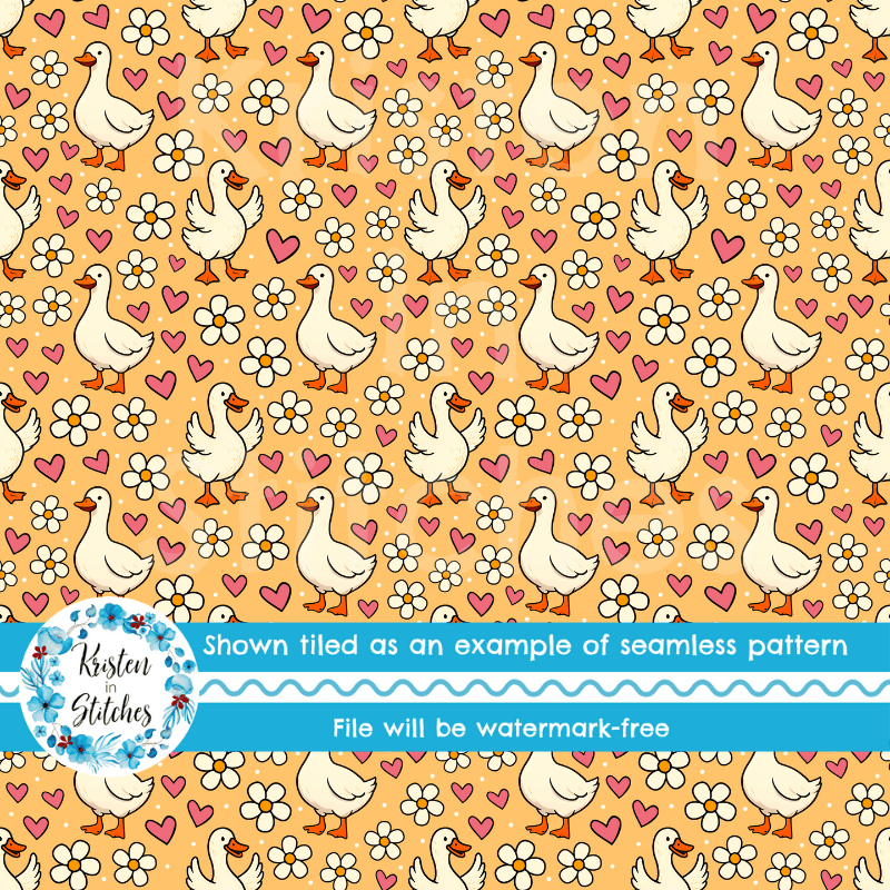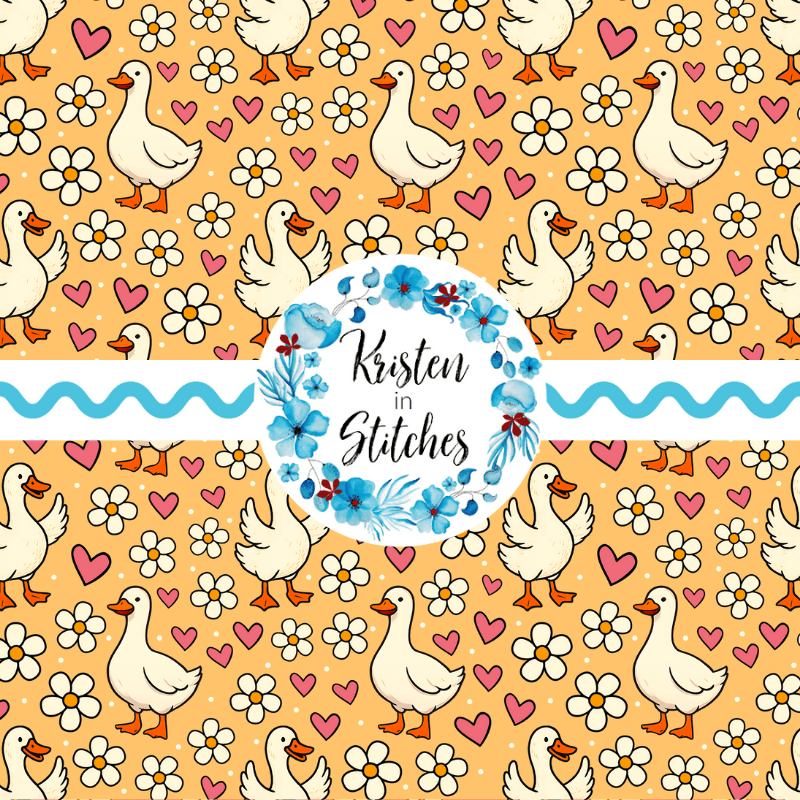 Spring Ducks Hearts and Daisy Flowers Seamless Pattern, Yellow