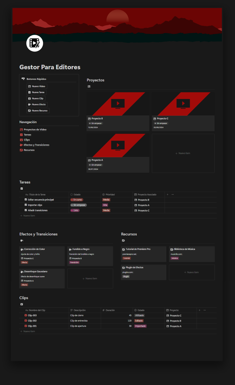 ¿Eres un editor que busca optimizar su flujo de trabajo y maximizar su productividad? Nuestra plantilla de Notion para editores es la herramienta ideal para ti. Diseñada específicamente para las necesidades de edición de video, esta plantilla te ayudará a mantener todo organizado y a la mano, desde la planificación de tareas hasta la gestión de recursos.