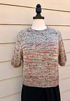 FADED HALO is knit in the round from the top down with raglan shaping. Color changes are worked at regular intervals for a gradient effect. After completing raglan increases, short sleeves and cropped body are separated and worked in the round, ending with 1×1 ribbing. Collar is picked up and worked in the round in 1×1 ribbing. Collar, cuffs and hem are finished with a tubular bind-off. Pattern is written for both a four color fade or a single color.