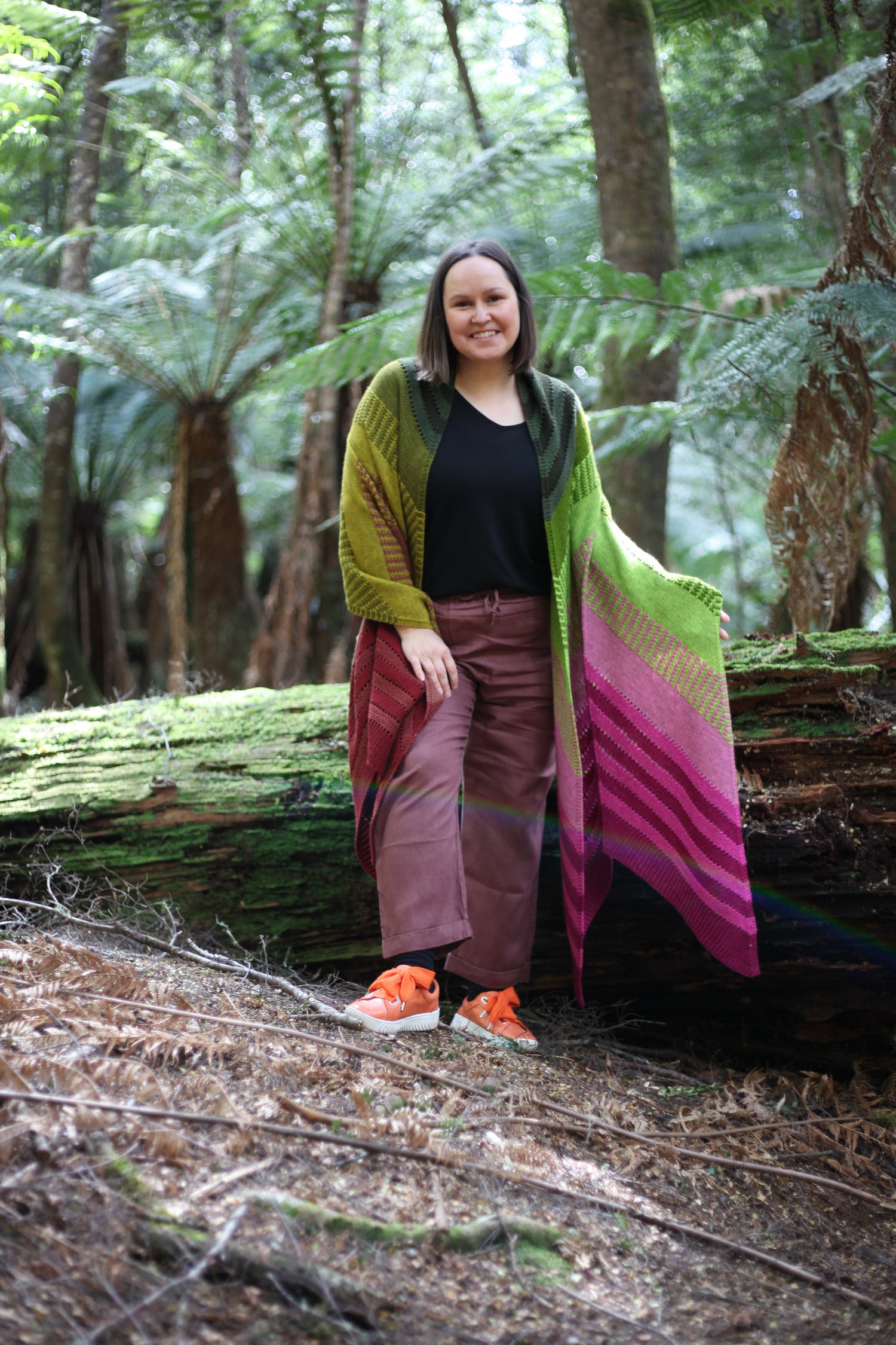 The design is an exploration of colours and textures in the Tasmanian Landscape. It features Susanna’s usual bold design lines yet is infused with soft textures and interesting transitions.