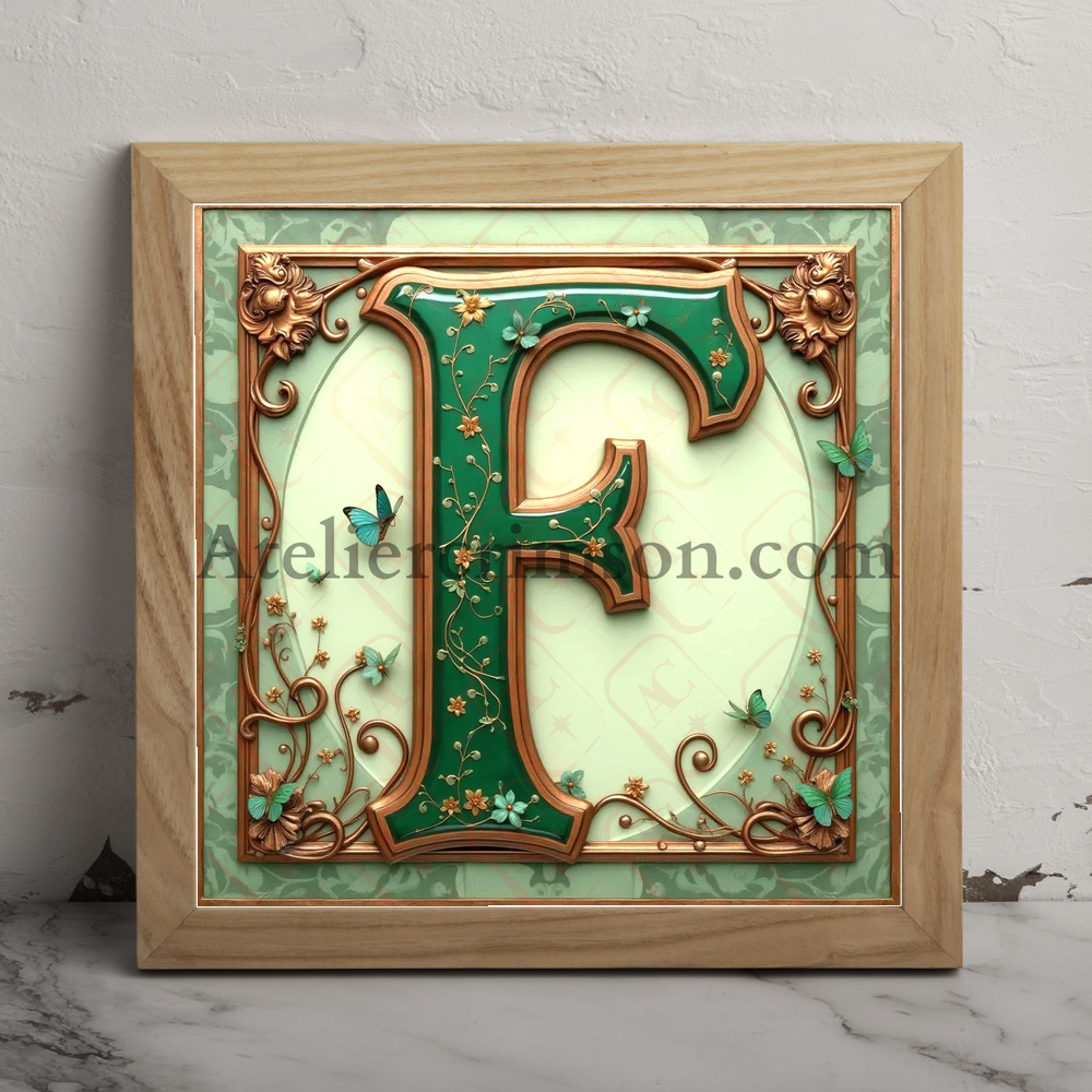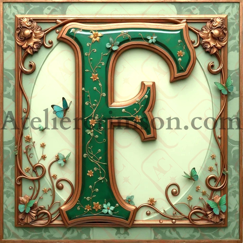 The letter F emerald and copper Art Nouveau Intricate design with floral patterns, butterflies, and vines. Elegant sage green background. Perfect for vintage lovers and typography enthusiasts.