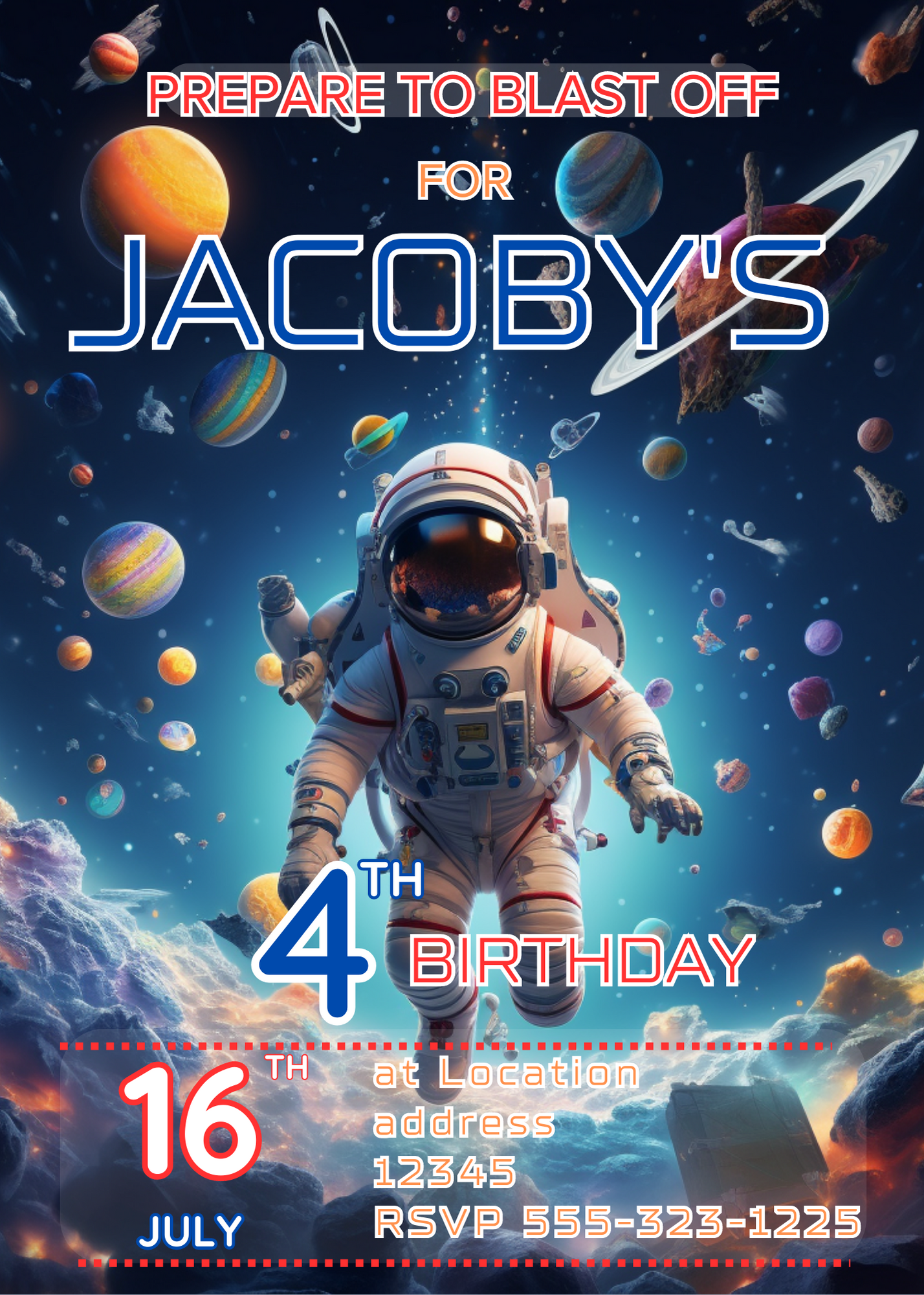 Let your child feel like an astronaut for their special day with this Blast into Space Astronaut Birthday Invitation. This invitation features an out of this world space theme, with an astronaut illustration that can be fully edited in Canva for a personalized touch. Make their birthday unforgettable!