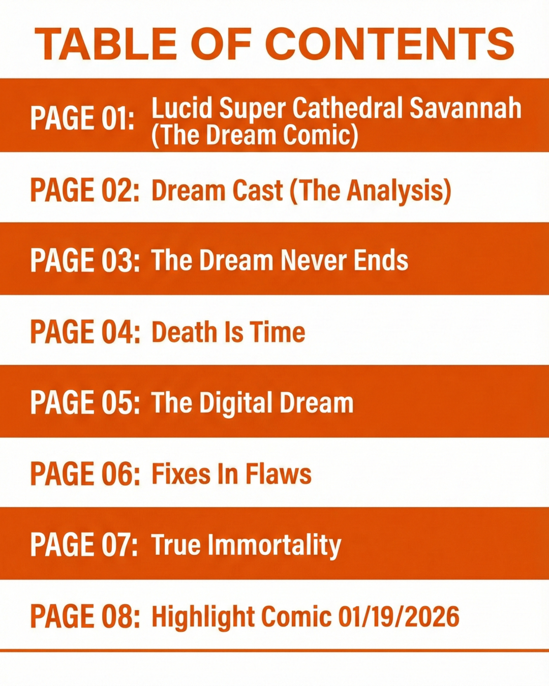 An eight page anthology of one page comics, all created in a single day.