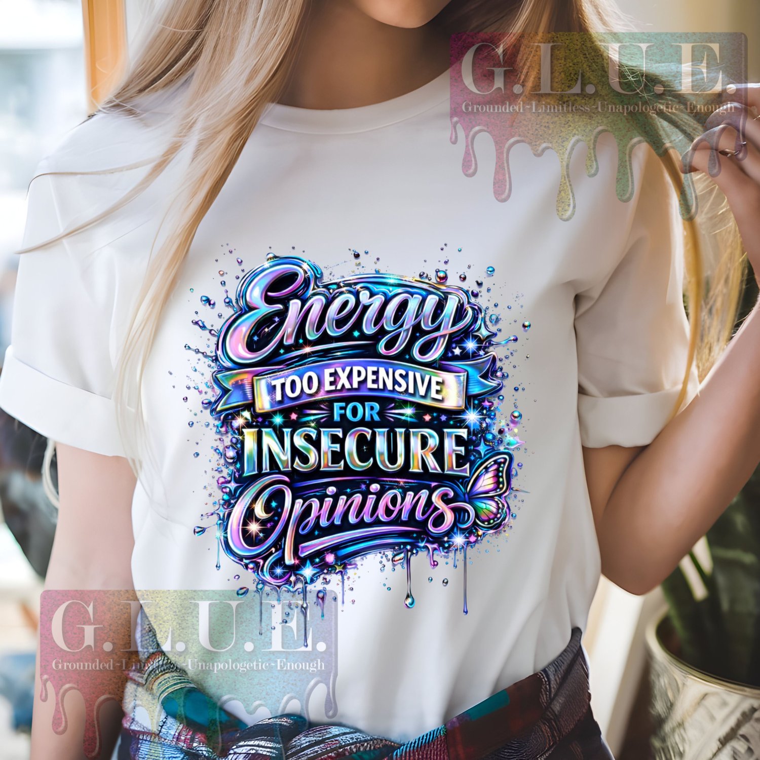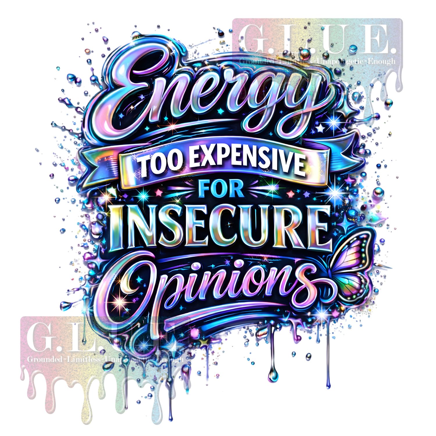 This high-impact digital design features the phrase “Energy Too Expensive for Insecure Opinions” in a stunning chrome, oil-slick metallic aesthetic with reflective highlights, drip effects, and a luxe butterfly accent. Designed for creators who love bold visuals and confident messaging, this PNG is perfect for apparel, accessories, stickers, and digital projects.