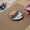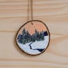Snowy landscape painted with acrylic paint on a pine wood slice.