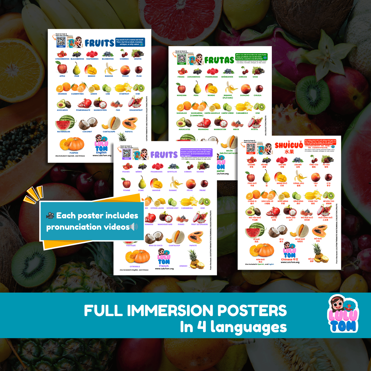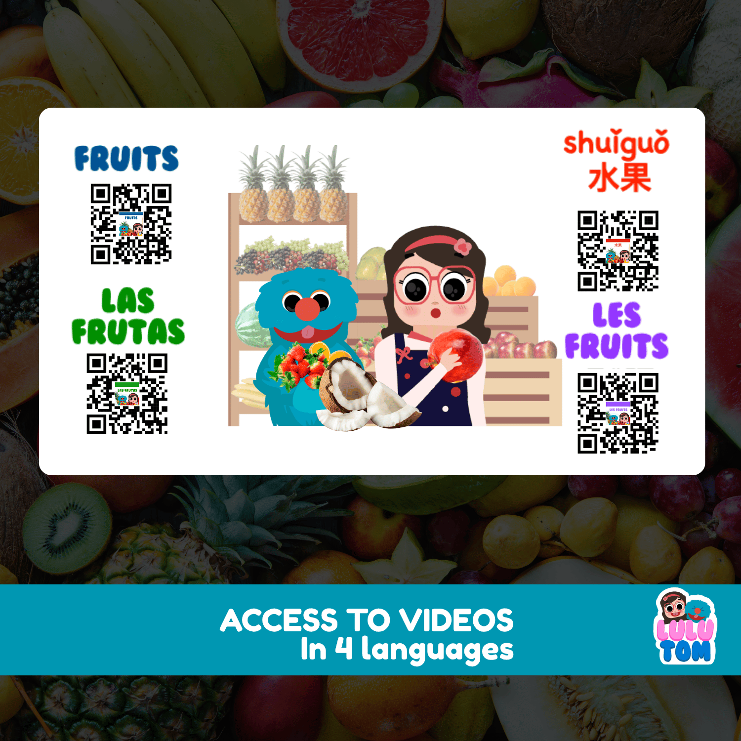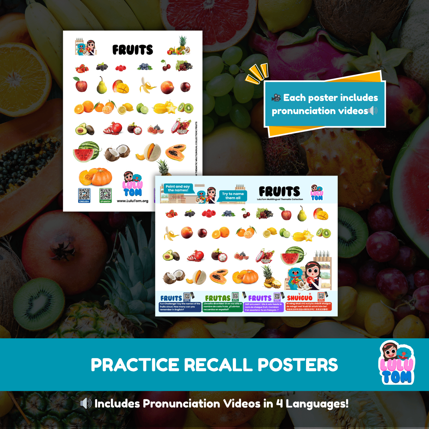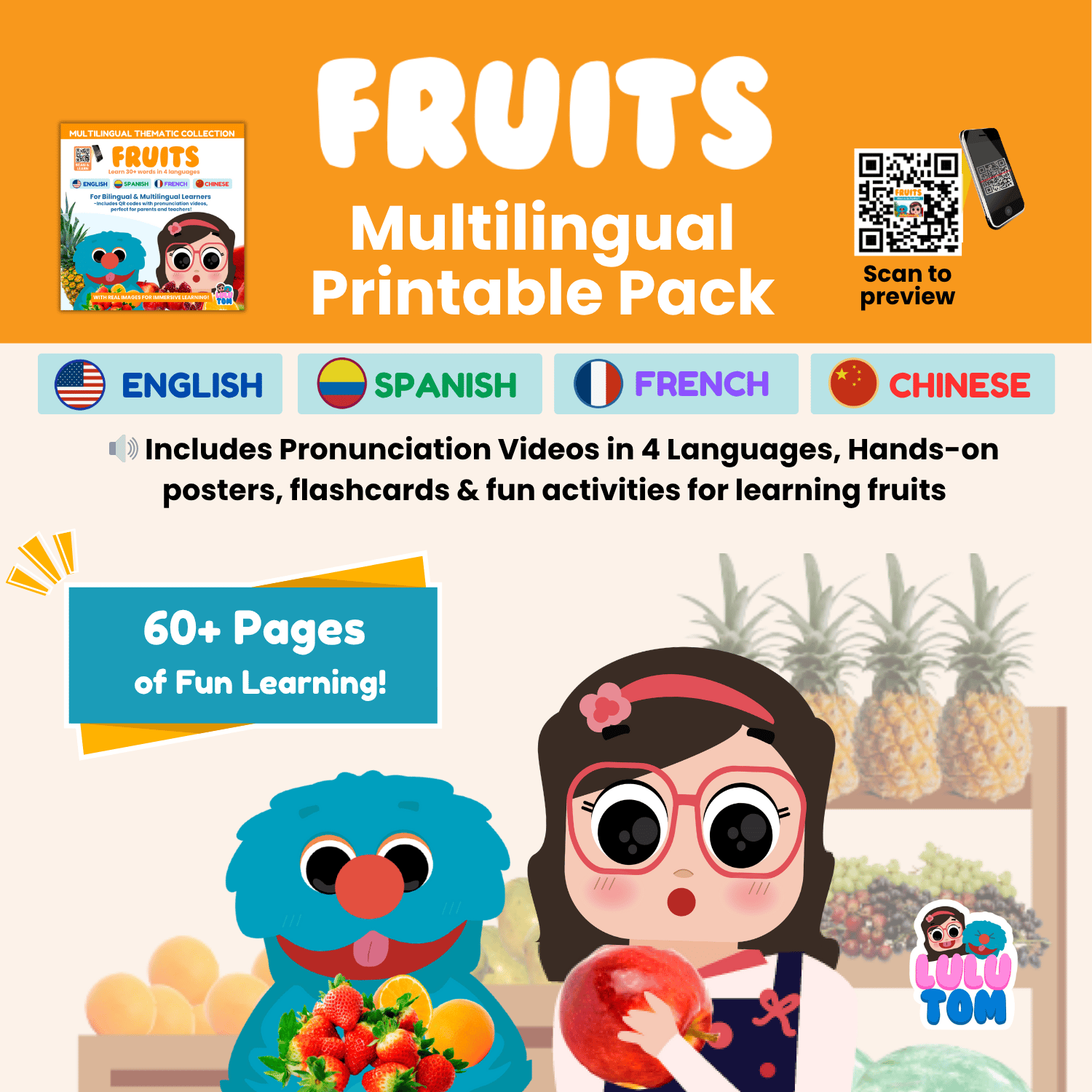 Scan the QR codes to hear Lulu & Tom say each fruit in English, Spanish, French, and Chinese — helping children (and parents!) learn real pronunciation naturally through repetition and play.
