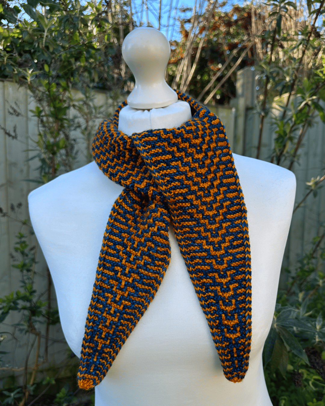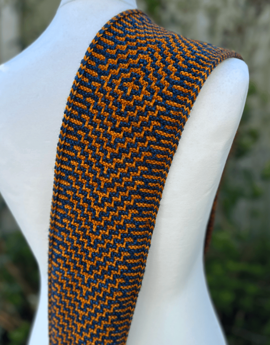 Temporal is a mosaic knit scarf with incorporated icord edges. Worked from end to end the scarf has a fixed width but can be knit to any length.