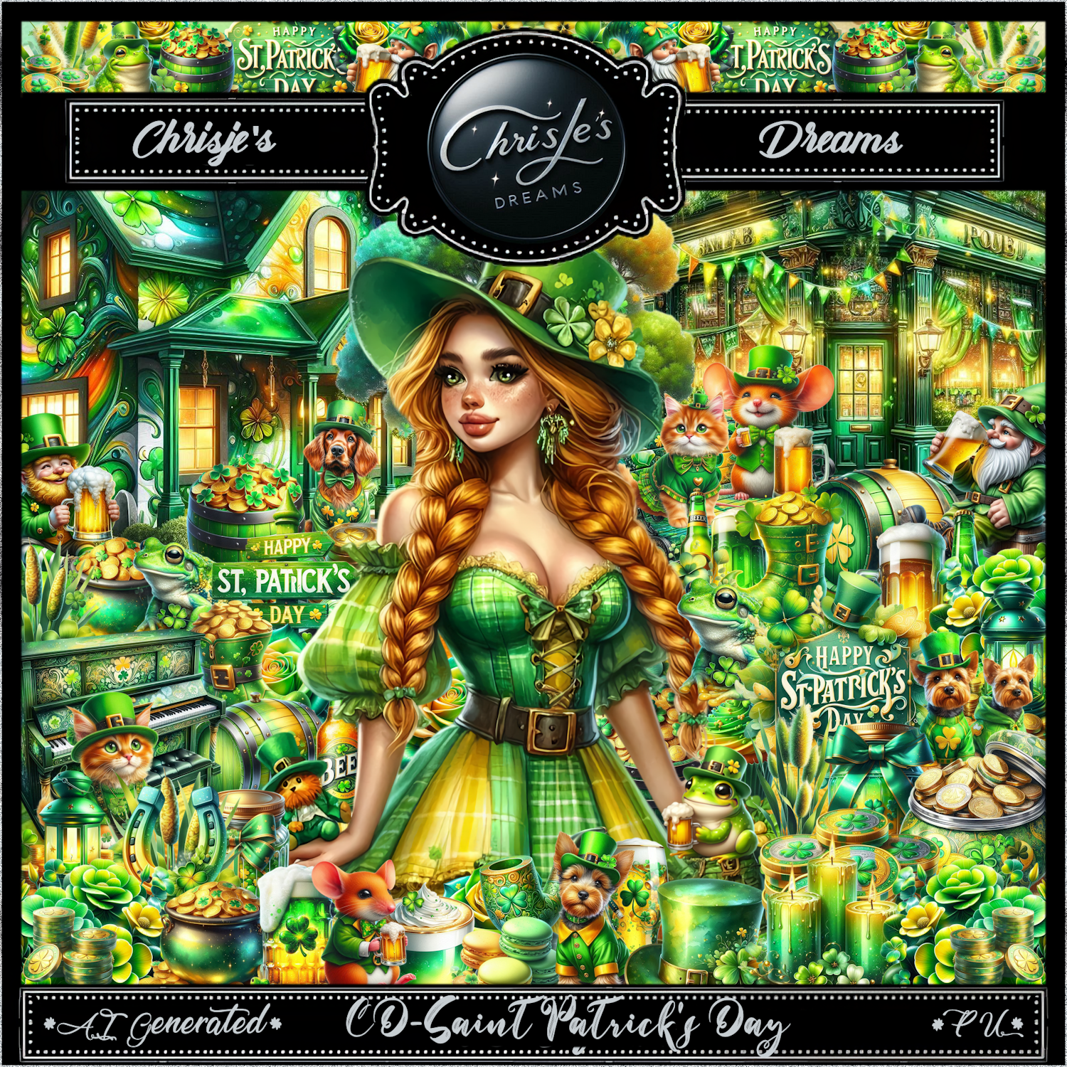 Saint Patrick's Day is a 🍀🍺St Patrick🍺🍀 themed kit which contains 147 elements, 7 Frames, 24 papers and 2 beautiful AI generated png tubes by Chrisje's Dreams.
