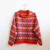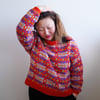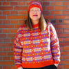 DANSK Molly Sweater er strikket oppefra og ned med flerfarvestrik og har en oversize pasform. Sweateren er strikket med to tråde Isager Spinni. Spinni er valgt, da garnet fungerer godt til strik, som klippes op. Denne opskrift anvender metoden “Hækl og klip op”, som er forklaret i opskriften. Du kan bruge din foretrukne metode.