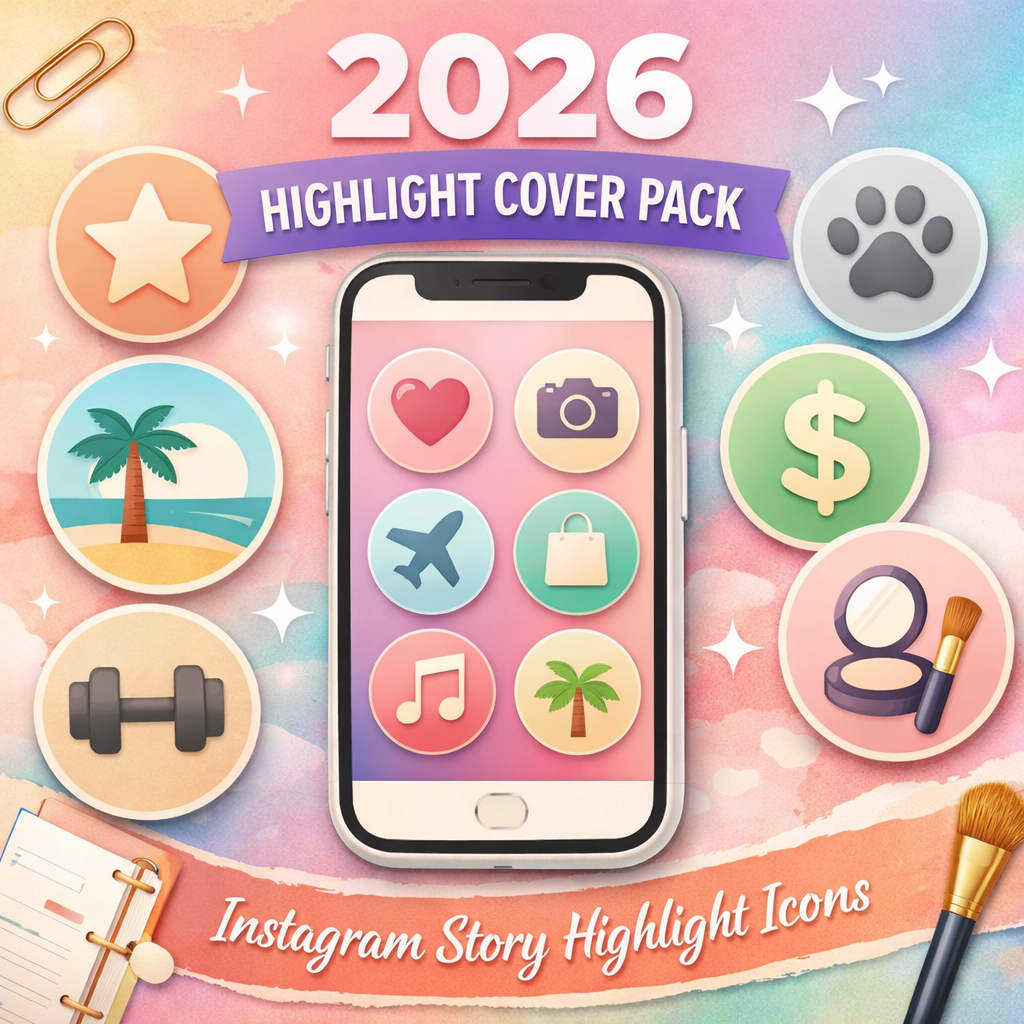 Elevate your Instagram profile with our 2026 Instagram Highlight Cover Icons Pack! This bundle includes 20 modern pastel icons for your story highlights, featuring minimalist illustrations like hearts, stars, cameras, planes, music notes and more. Each icon is a 1080 × 1080 PNG with a soft pastel background and clean vector illustration.