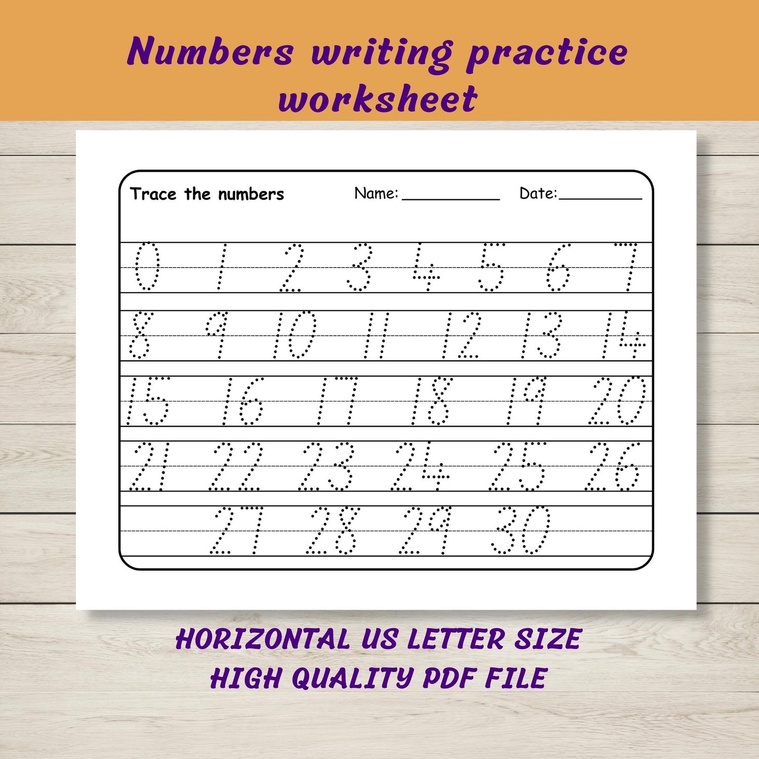 - 1 Numbers 0-30 handwriting practice worksheet.