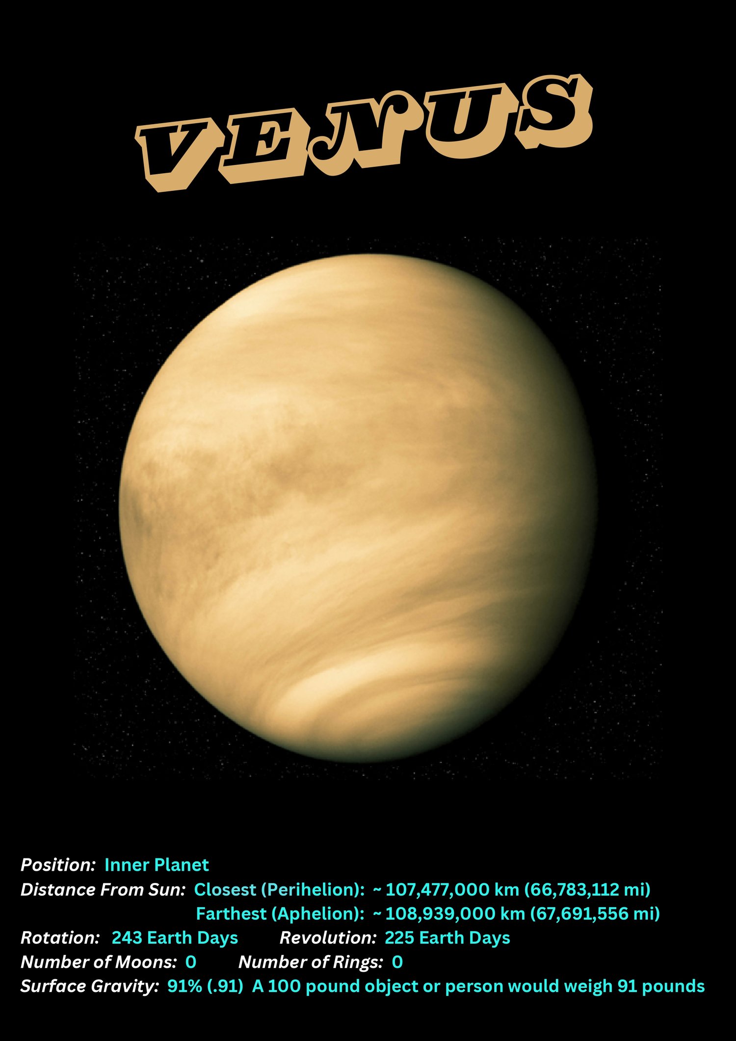 Venture into the realm of Venus, our closest planetary neighbor, with the 4-page ‘COSMIC TIDBITS Venus FACTS’ fact sheet. This comprehensive guide invites you to explore the enigmatic world of Venus, often called Earth’s ‘twin’ due to their similar size. Uncover the secrets of its dense, toxic atmosphere, perpetual cloud cover, and surface marked by volcanoes and deformed mountains. Learn about the greenhouse effect that makes it the hottest planet in our solar system. Delve into the mysteries of Venus’ retrograde rotation and the curious lack of a magnetic field. This fact sheet, suitable for middle school students to adults, is a captivating resource for those eager to learn more about the intriguing planet Venus.