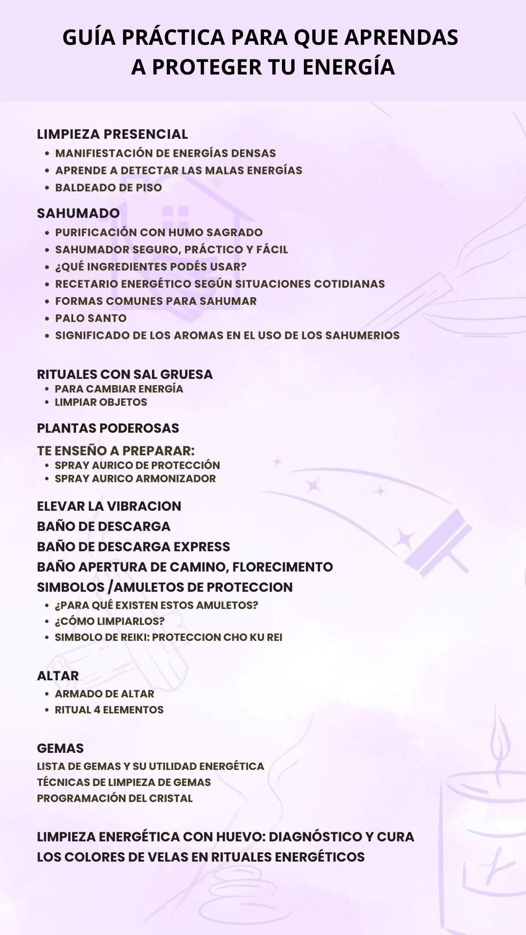 En sus páginas encontrarás rituales con hierbas, sal, velas, gemas y sahumados; baños de descarga; sprays áuricos; técnicas con amuletos y símbolos, además de la limpieza energética con huevo y un recetario para situaciones cotidianas.
