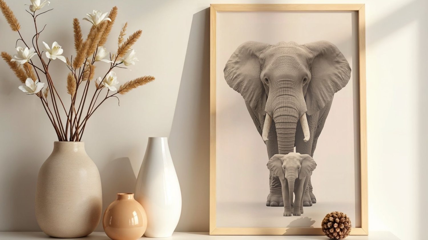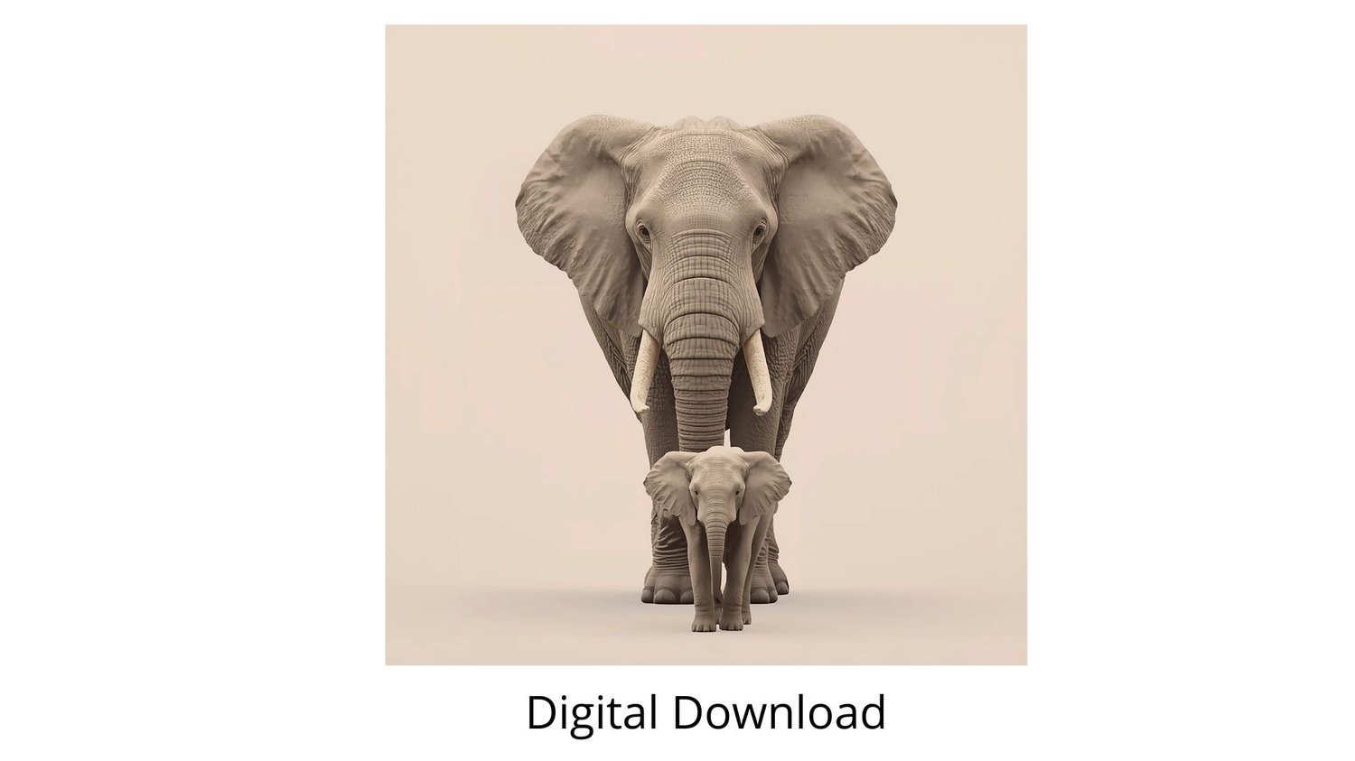 Heartwarming elephant and calf wall art printable with calm neutral tones.