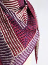 Moondrake Co Tweedy DK (75% superwash merino, 25% mulberry silk; 230yds/210m per 100g skein); 1 skein each in Deep Violet (A), Pink Salt (B), and Beni (C)