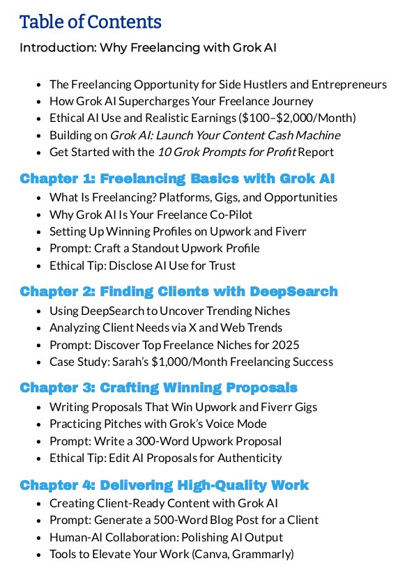 Score Freelancing with Grok AI for a steal at just $5! Bundle it with Grok AI: Launch Your Content Cash Machine ($5) and the free 10 Grok Prompts for Profit report to turbocharge your hustle into overdrive.