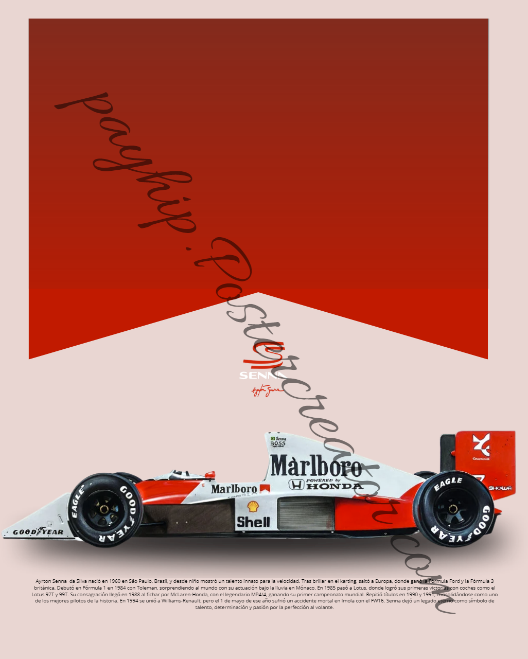 Leyenda y velocidad en una sola pieza. Adquiere esta icónica impresión del McLaren Honda de Ayrton Senna. Captura la ingeniería y la maestría del tricampeón, con su firma sobre un vibrante fondo rojo. Un fragmento de historia de F1 que inspira. ¡Haz tuya la leyenda!