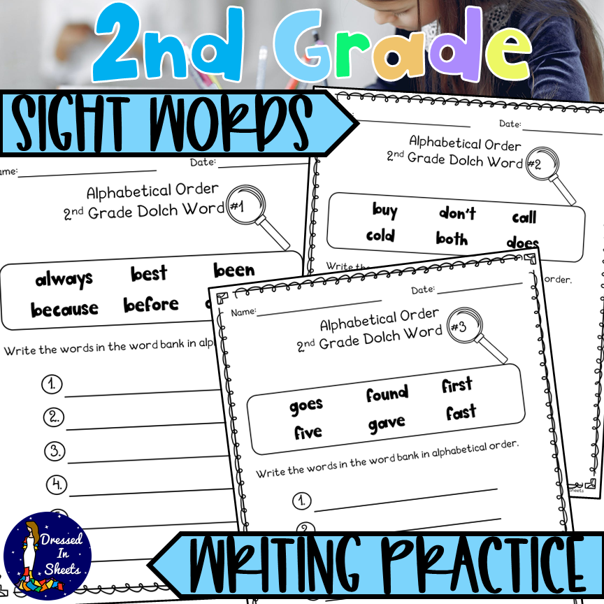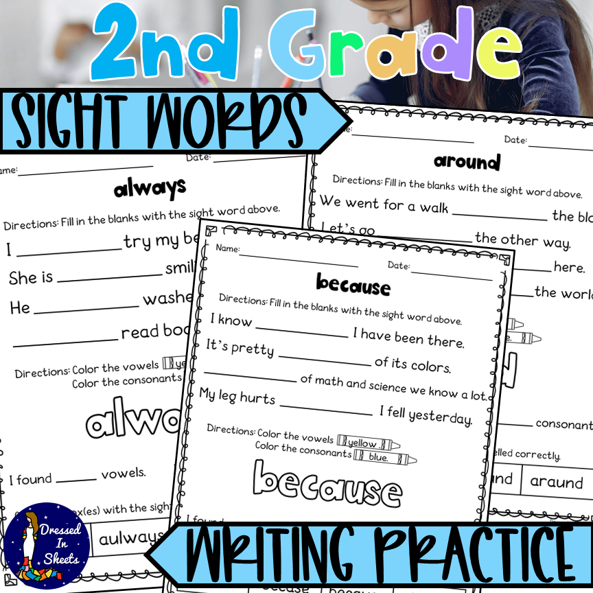 Dolch sight words included: always, around, because, been, before, best, both, buy, call, cold, does, don't, fast, first, five, found, gave, goes, green, its, made, many, off, or, pull, read, right, sing, sit, sleep, tell, their, these, those, upon, us, use, very, wash, which, why, wish, work, would, write, your.