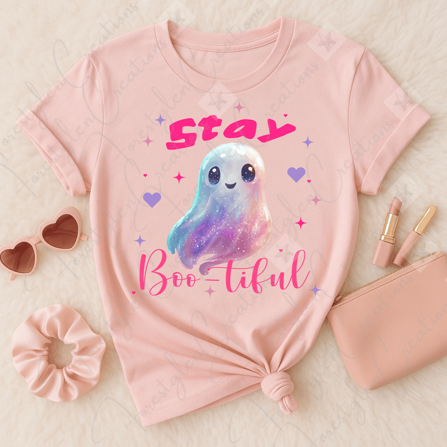 Sweet, spooky, and sparkly β this adorable pastel ghost design is perfect for all the girly ghouls out there! Featuring a rainbow glitter ghost with the words βStay Boo-tiful,β this file is ready to glam up your shirts, tumblers, tote bags, and more!