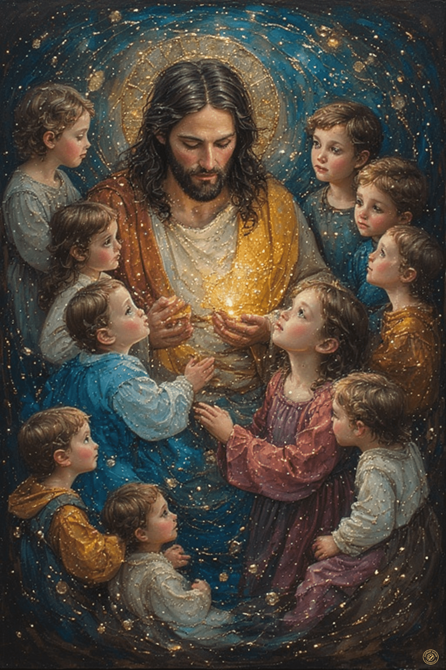 Een figuur in wit en goud, omgeven door kinderen, houdt een lichtbron in zijn handen.