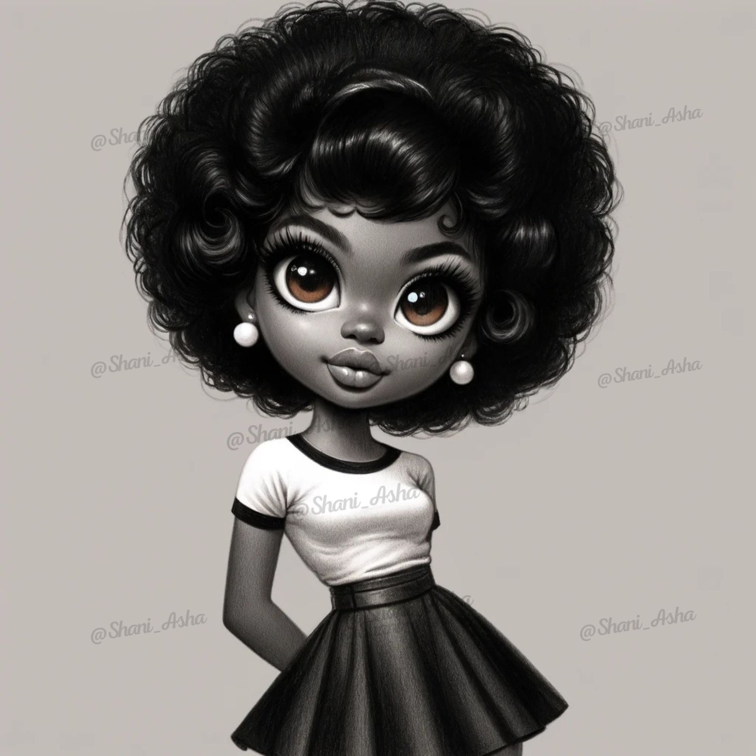 With her expressive cocoa-hued eyes, perfectly coiffed curls, and classic pearl earrings, Beverly brings timeless Black girl magic to life. Her black-and-white ensemble pops against the neutral background, creating a chic, minimalist statement with maximum personality.