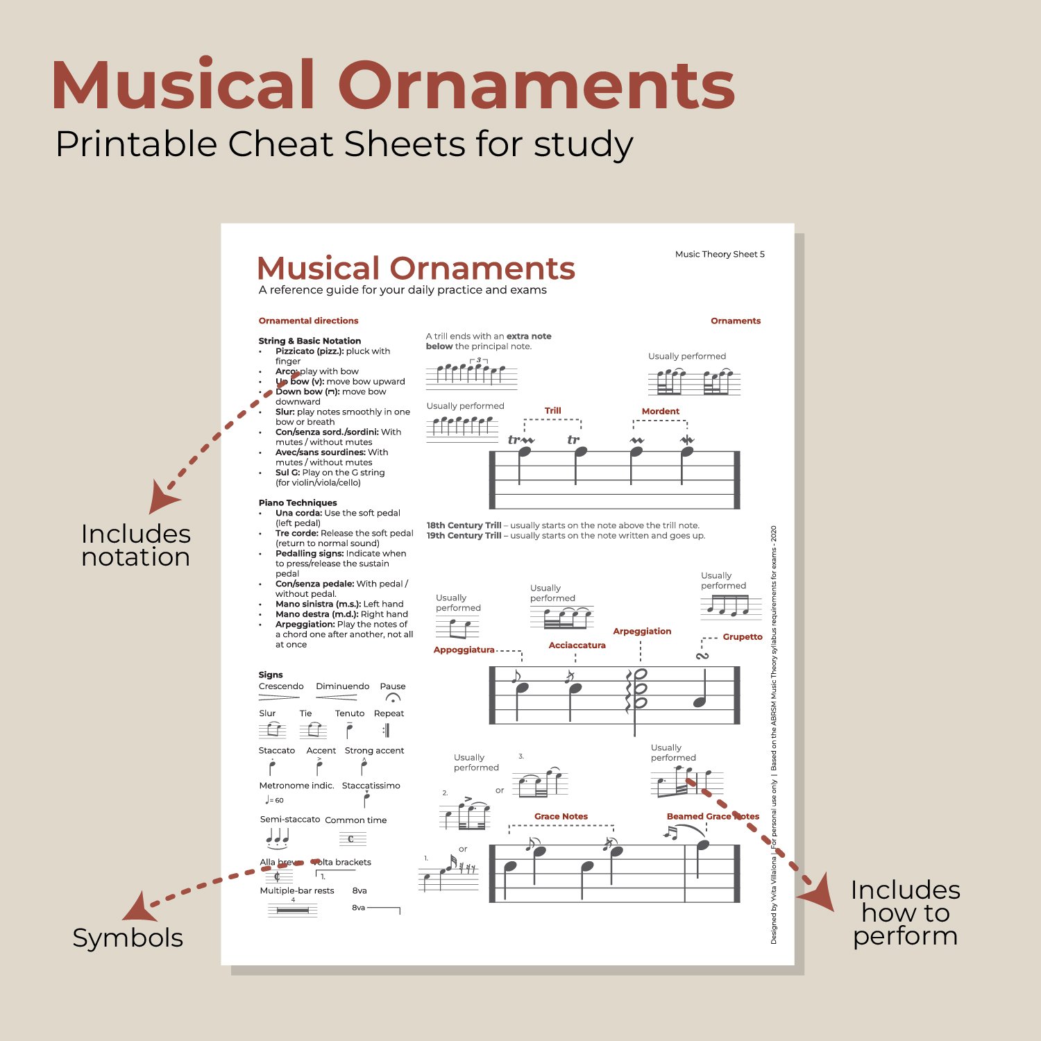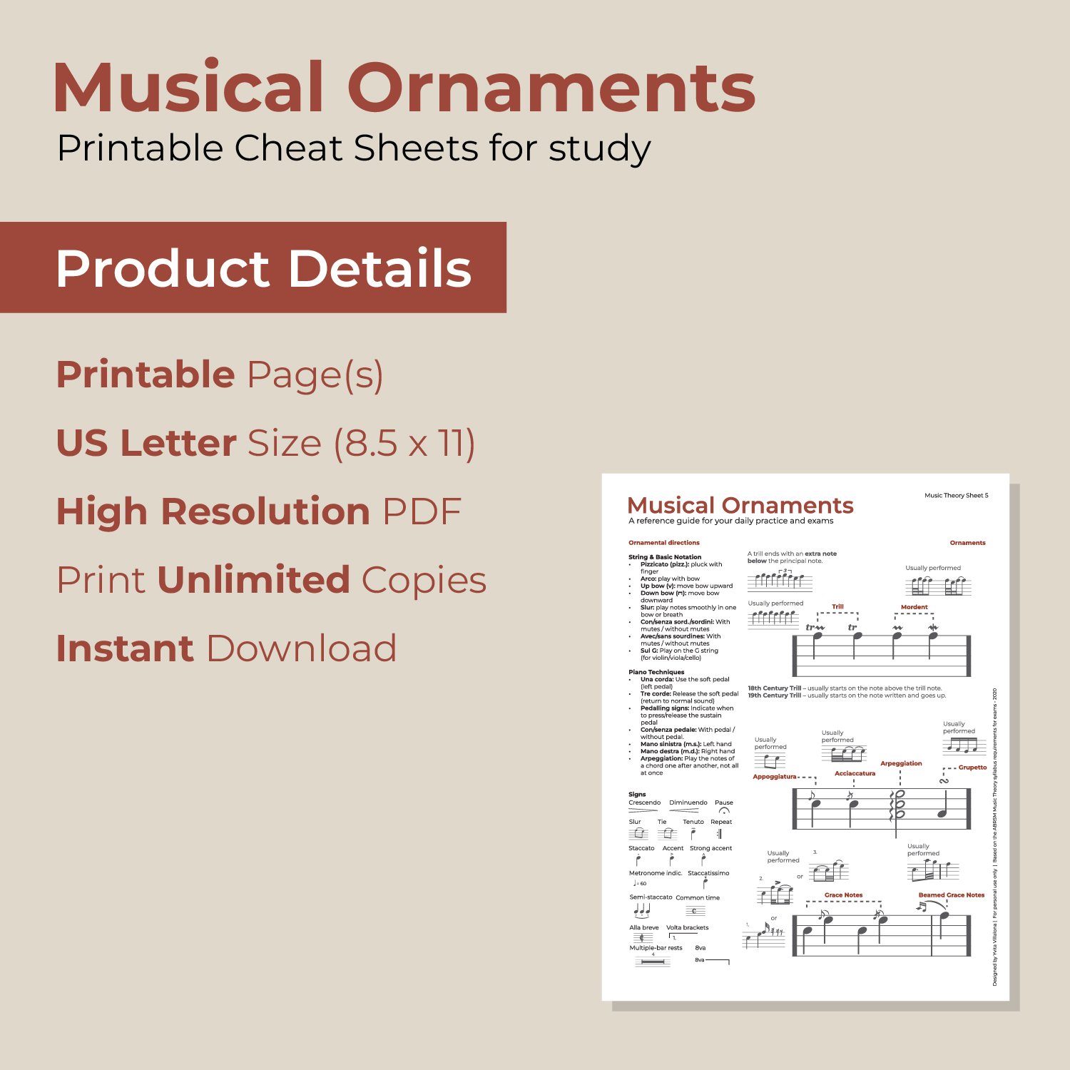 Musical Ornaments Cheat Sheet | Music Theory Ornament Guide | Trills, Mordents, Turns & Grace Notes | Printable Study Sheet | Instant Download