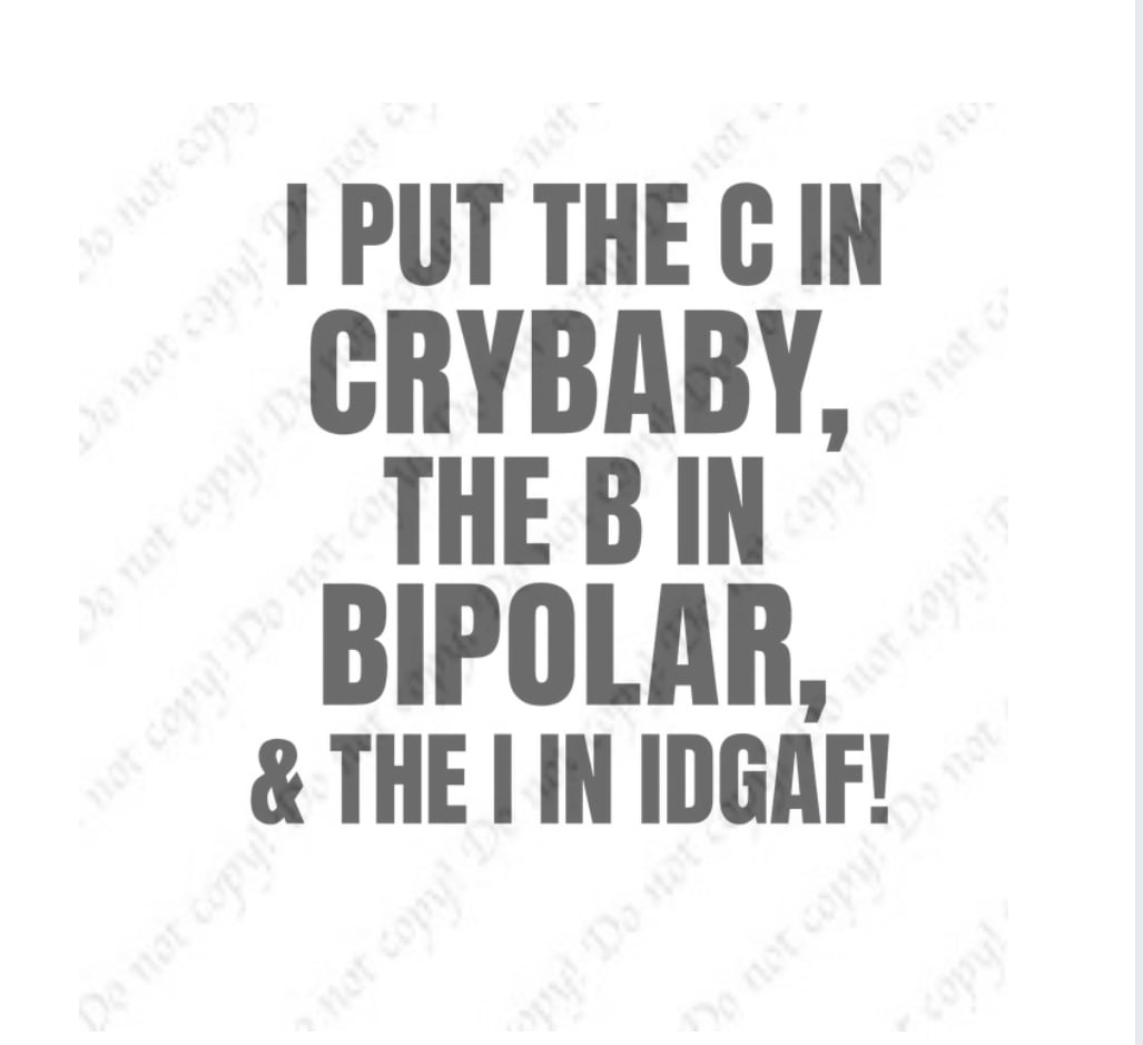 Add bold personality to your next project with the “I Put the C in Crybaby, the B in Bipolar, & the I in IDGAF!” PNG. This high-quality digital design features striking black typography in the Anton font — clean, crisp, and perfect for confident statement pieces. Ideal for T-shirt designs, hoodies, tote bags, mugs, or digital artwork, this PNG brings sass and attitude to any creation. The file includes a transparent background for effortless layering and printing on light or dark materials.