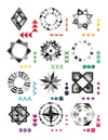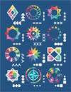 Welcome Kit, Bright Star, Constellation, Diamond Lattice, Entwined, Flight (curves + no curves version), Hexie (A4/Letter sizes) Interwoven, Rainbow Compass (curves + no curves), Shimmer, Sparkler, Starbust, Woven, Bubbles Border, Crosses Border, Dashes Border, Diamonds Border, Geese Border, Hearts Border, Hexies Border, Kisses Border, Stars Border, Triangles Border, Zig Zag Border and assembly instructions.