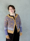 This is a pattern for a adjusted dropped sleeve cardigan. It is worked from the bottom up and in the round with multiple steeks. if you are using a 7 st steek, any reinforcement should work well. However, if you are using smaller steeks, machine sewn steek reinforcement is suggested with Gerty yarn. There are 3 rounds using 3 colours. There is no waist shaping for this project.
