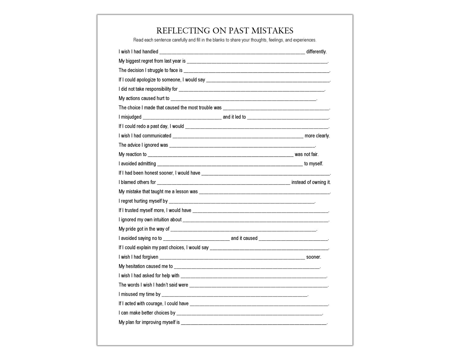 Learn from your past without letting it hold you back. This Reflecting on Past Mistakes worksheet features 30 prompts to help you analyze missteps, figure out what went wrong, and plan a better way forward. Use it for therapy sessions, journaling, or self-reflection to guide you through challenges and boost your confidence in handling setbacks. Stop dwelling on the past and start planning your next, wiser move!