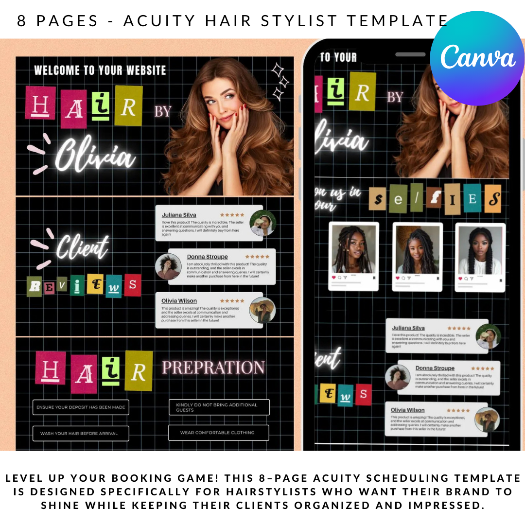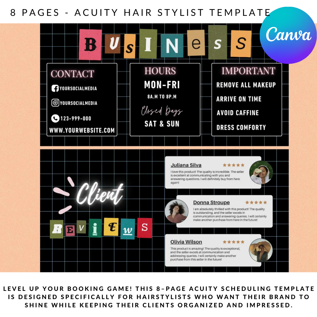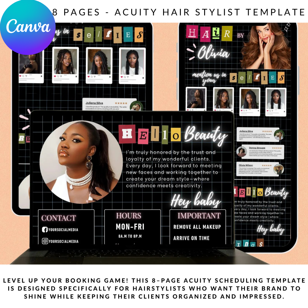 Level up your booking game! This 8 page Acuity Scheduling template is designed specifically for hairstylists who want their brand to shine while keeping their clients organized and impressed. From services to policies, every page is laid out to give your business that polished, professional feel without losing your unique vibe.