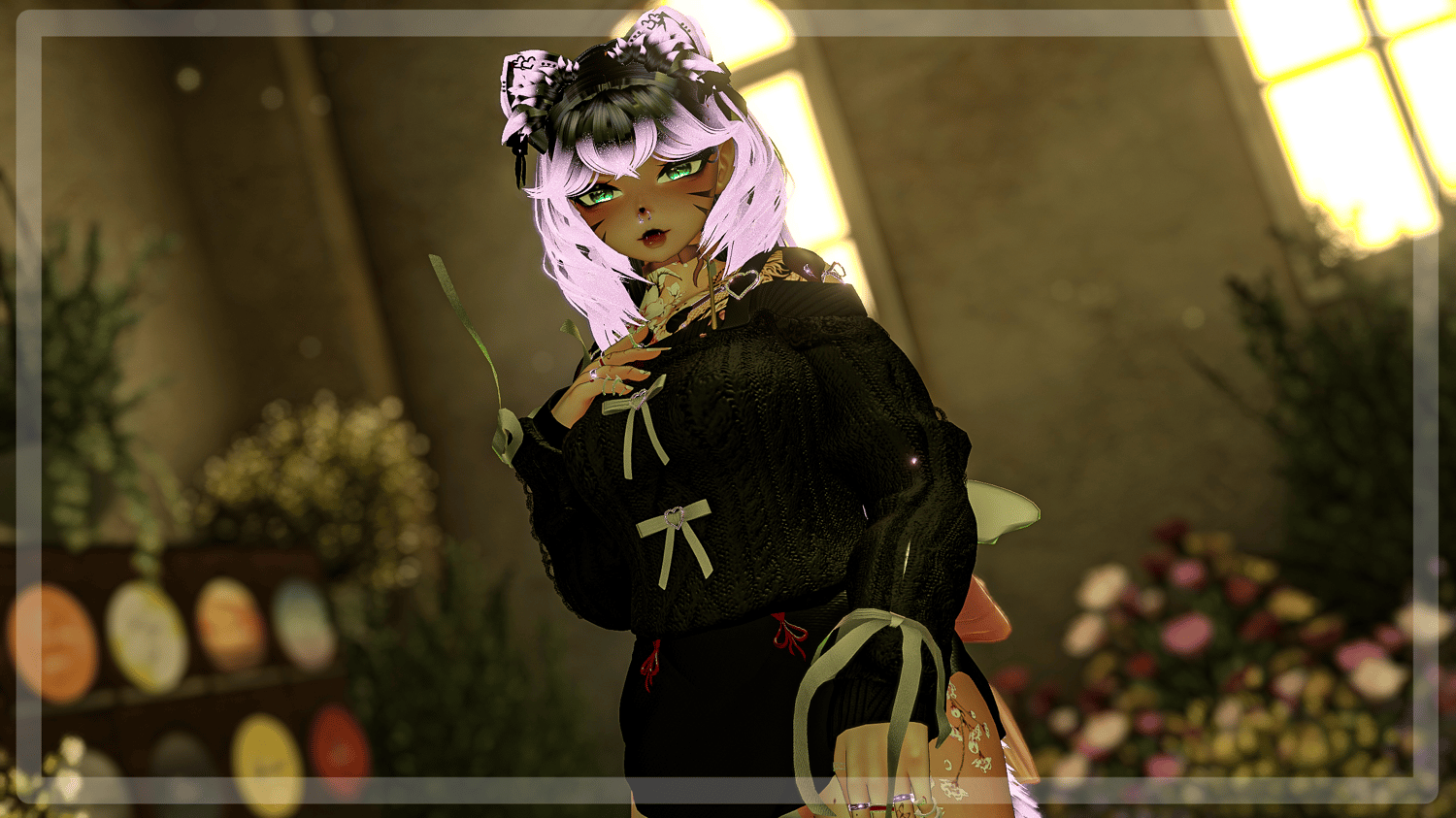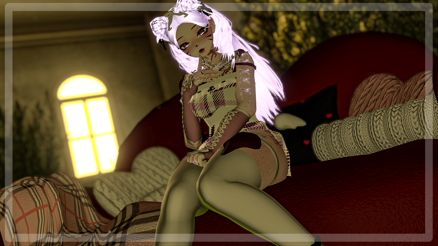 - body - Zinpia (edit no reuse), head (edit no reuse), face texture (edit no reuse), nose piercing by me, bra and pantie, flow toys, cute bed. menue icons, eye texture, hair 1, hair 2, hair 3, hair 4. stockings, shorts, sweater, outfit, fangs, glasses, rings, heels, ears and tail, necklace, gloves, ribbon piercings, boots, tattoos, particle system