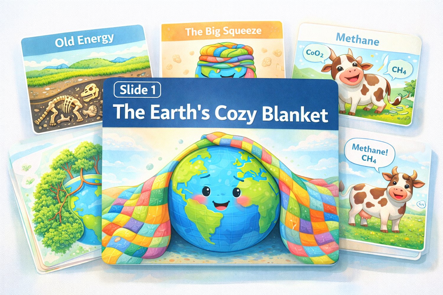 - 20 High-Impact Slides: Beautifully designed visuals covering the Causes (The Cozy Blanket, Old Energy), Effects (Earth's Fever, Melting Mirrors), and Solutions (Sun Power, Plant Power).
